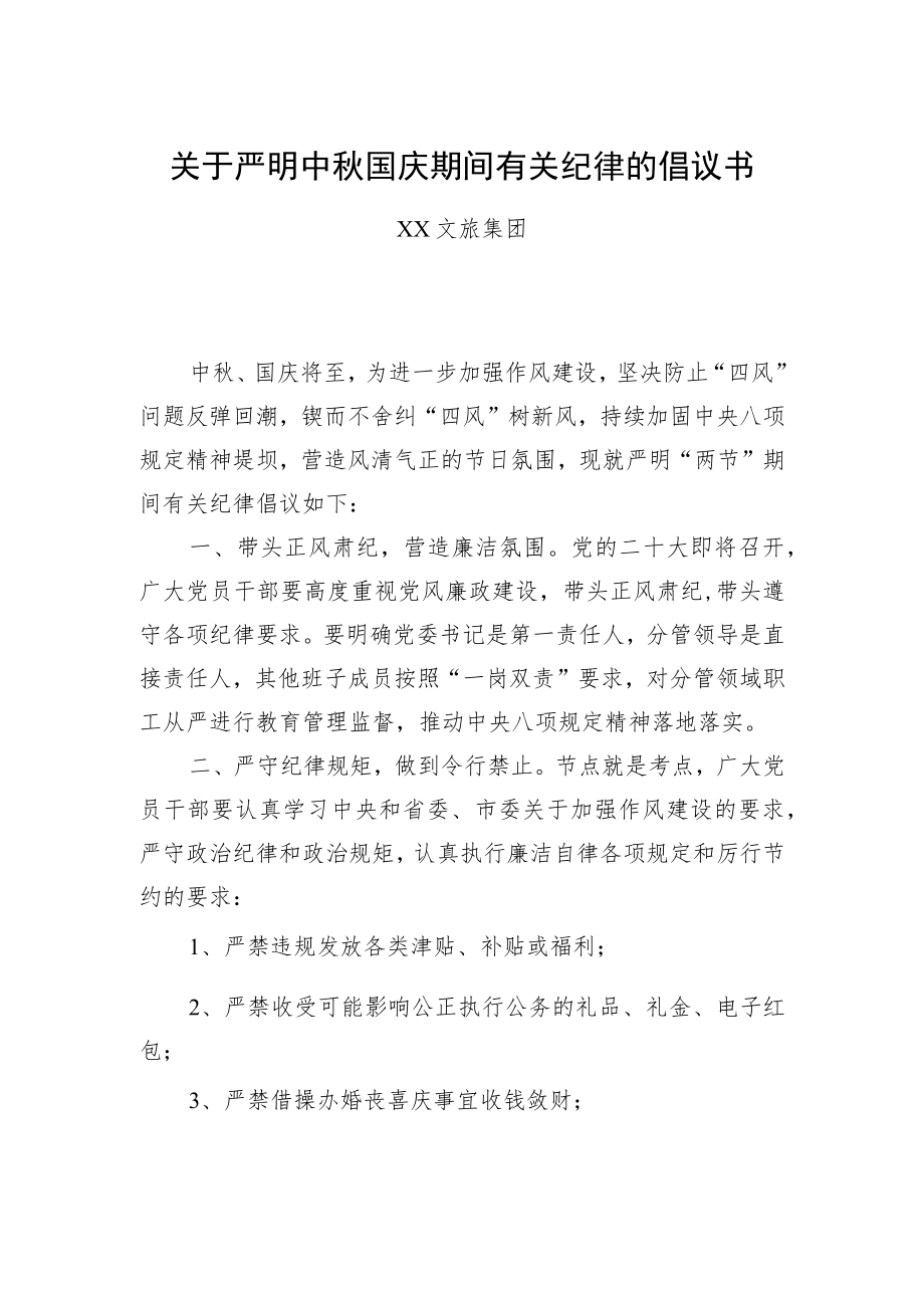 1、关于严明中秋国庆期间有关纪律的倡议书XX文旅集团中秋、国庆将至,为进一步加强作风建设,坚决防止“四风”问题反弹回潮,锲而不舍纠“四风”树新风,持续加固中央八项规定精神堤坝,营造风清气正的节日氛围,现就严明“两节”期间有关纪律倡议如下:一、带头正风肃纪,营造廉洁氛围。党的二十大即将召开,广大党员干部要高度重视党风廉政建设,带头正风肃纪,带头遵守各项纪律要求。要明确党委书记是第一责任人,分管领导是直接责任人,其他班子成员按照“一岗双责”要求,对分管领域职工从严进行教育管理监督,推动中央八项规定精神落地落实。二、严守纪律规矩,做到令行禁止。节点就是考点,广大党员干部要认真学习中央和省委、市委关于加强