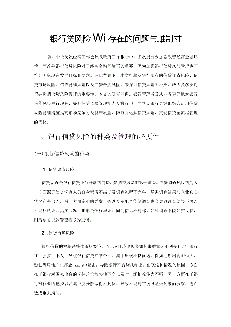 1、银行贷风险Wi存在的问题与雌制寸目前,中央历次经济工作会议及政府工作报告中,多次提到要加强改善经济金融环境,而改善银行信贷风险对于经济金融环境至关重要,因为加强银行信贷风险管理也正符合国家现在发展目标和要求。在此背景下,本文打算从银行现存的信贷调查风险、信贷市场风险、信贷管理风险以及信贷合规风险,来探讨信贷风险的种类、成因及解决对策并强调信贷风险管理的重要性。本文的研究能促进银行管理者及从业者更好地对银行信贷风险进行理解,提升信贷风险管理能力及执行力,并帮助银行更好地综合运用信贷风险管理措施提高市场竞争力及资产质量,防范并化解信贷风险,实现信贷全流程管理的优化。一、银行信贷风险的种类及管理的必
