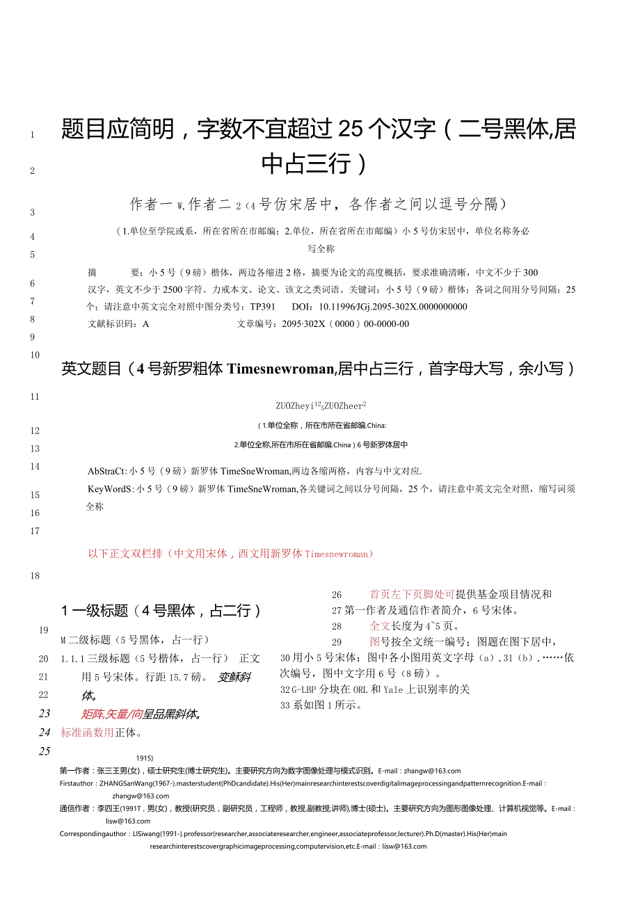 1、12345678910111213141516171819202122232425题目应简明,字数不宜超过25个汉字(二号黑体,居中占三行)作者一W,作者二2(4号仿宋居中,各作者之间以逗号分隔)(1.单位至学院或系,所在省所在市邮编;2.单位,所在省所在市邮编)小5号仿宋居中,单位名称务必写全称摘要:小5号(9磅)楷体,两边各缩进2格,摘要为论文的高度概括,要求准确清晰,中文不少于300汉字,英文不少于2500字符。力戒本文、论文、该文之类词语。关键词:小5号(9磅)楷体;各词之间用分号间隔;25个;请注意中英文完全对照中图分类号:TP391DOI:10.11996JGj.2095-302X