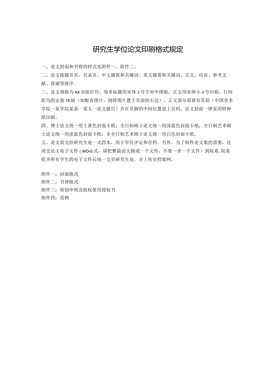 1、研究生学位论文印刷格式规定一、论文封面和书脊的样式见附件一、附件二。二、论文按题名页,目录页、中文摘要和关键词、英文摘要和关键词、正文、结论、参考文献、致谢等排序。三、论文规格为A4双面打印。每章标题用宋体3号字对中排版,正文用宋体小4号印刷,行间距为固定值18磅(如配有图片,则将图片置于页面的右边),正文部分需要有页眉(中国美术学院一某学院某系一某人一论文题目)并在页脚的中间位置放上页码。论文封面一律采用特种纸印刷。四、博士论文统一用土黄色封面卡纸;全日制硕士论文统一用深蓝色封面卡纸;全日制艺术硕士论文统一用淡蓝色封面卡纸;非全日制艺术硕士论文统一用白色封面卡纸。五、论文需交给研究生处一式四