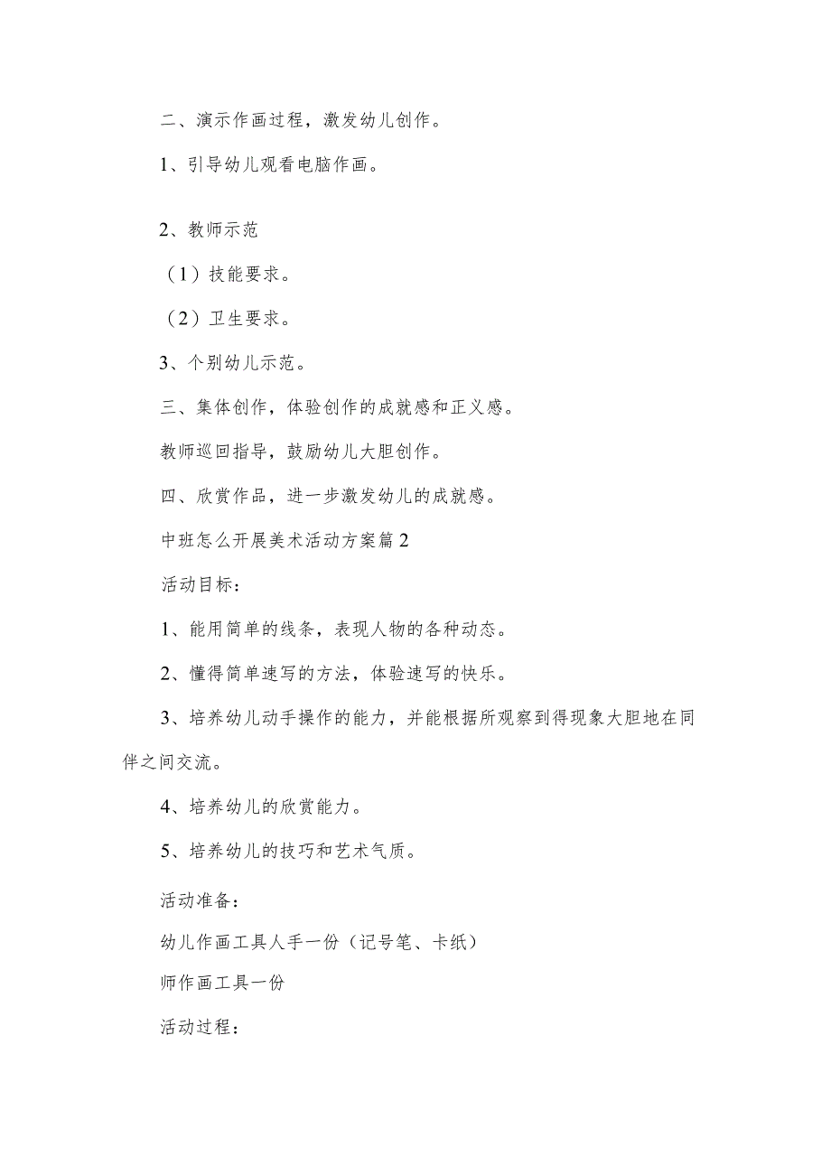 2、3、个别幼儿示范。三、集体创作,体验创作的成就感和正义感。教师巡回指导,鼓励幼儿大胆创作。四、欣赏作品,进一步激发幼儿的成就感。中班怎么开展美术活动方案篇2活动目标:1、能用简单的线条,表现人物的各种动态。2、懂得简单速写的方法,体验速写的快乐。3、培养幼儿动手操作的能力,并能根据所观察到得现象大胆地在同伴之间交流。4、培养幼儿的欣赏能力。5、培养幼儿的技巧和艺术气质。活动准备:幼儿作画工具人手一份(记号笔、卡纸)师作画工具一份活动过程:一、师现场作画(添画),逐步出示。1、师画圆,引导幼儿:你们看,这是什么?(逐步引导,方法同)o人物速写完成,师提问:他在干什么?(站着)那里看出来的?(脚)