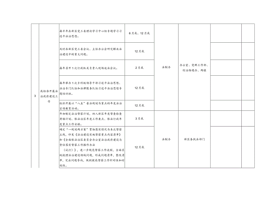 2、8月底、11月底1以高质量法治环境保障新区高质量发展充分发挥“府院联动皿府检联动公安联动”机制作用,深入推动行政与司法资源整合、力量集合、手段聚合,共同维护社会稳定、打击经济犯罪、防范金融风险,为新区经济社会高质量发展提供更加有力的法治保障。每月底法制办新区各部门、新区法庭、XX新区检察室、公安专班根据关于开展安徽省社会信用体系建设示范县(市、区)创建工作的通知要求,围绕制度建设、信用信息基础设施建设、信用服务实体经济、信用监管、信用领域突出问题整治、征信体系建设及金融风险防范、诚信文化建设七大方面开展示范园区创建工作。6月底、12月底法制办新区各部门2依法解决巡视巡察涉诉涉法类问题整改成立整