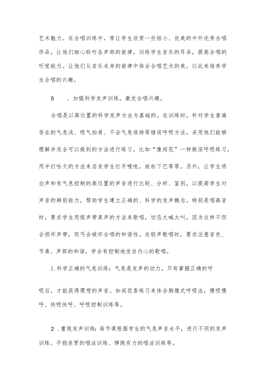 2、建并弘扬学校的人文精神。3 .通过各种形式的学习活动及艺术实践,提高学生的艺术修养和艺术兴趣,推动学校精神文明不校园文化建设。三、活动措施4 、加强合唱欣赏,培养合唱兴趣兴趣是最好的老师,也是推动学生积极学习的强大动力。只有学生对合唱艺术有了兴趣,他们才能自觉、认真地唱好每一个音符,充分领会歌曲所要表达的内容,从而注意各声部的协和,努力体现合唱精品的艺术魅力。在合唱训练中,常让学生欣赏一些短小、优美的中外优秀合唱作品,让他们细心聆听各声部的旋律,训练学生音乐的耳朵,提高合唱的听觉能力。让他们从音乐本身的旋律中体会合唱艺术的美,以此来培养学生合唱的兴趣。5 、加强科学发声训练,激发合唱兴趣。合唱