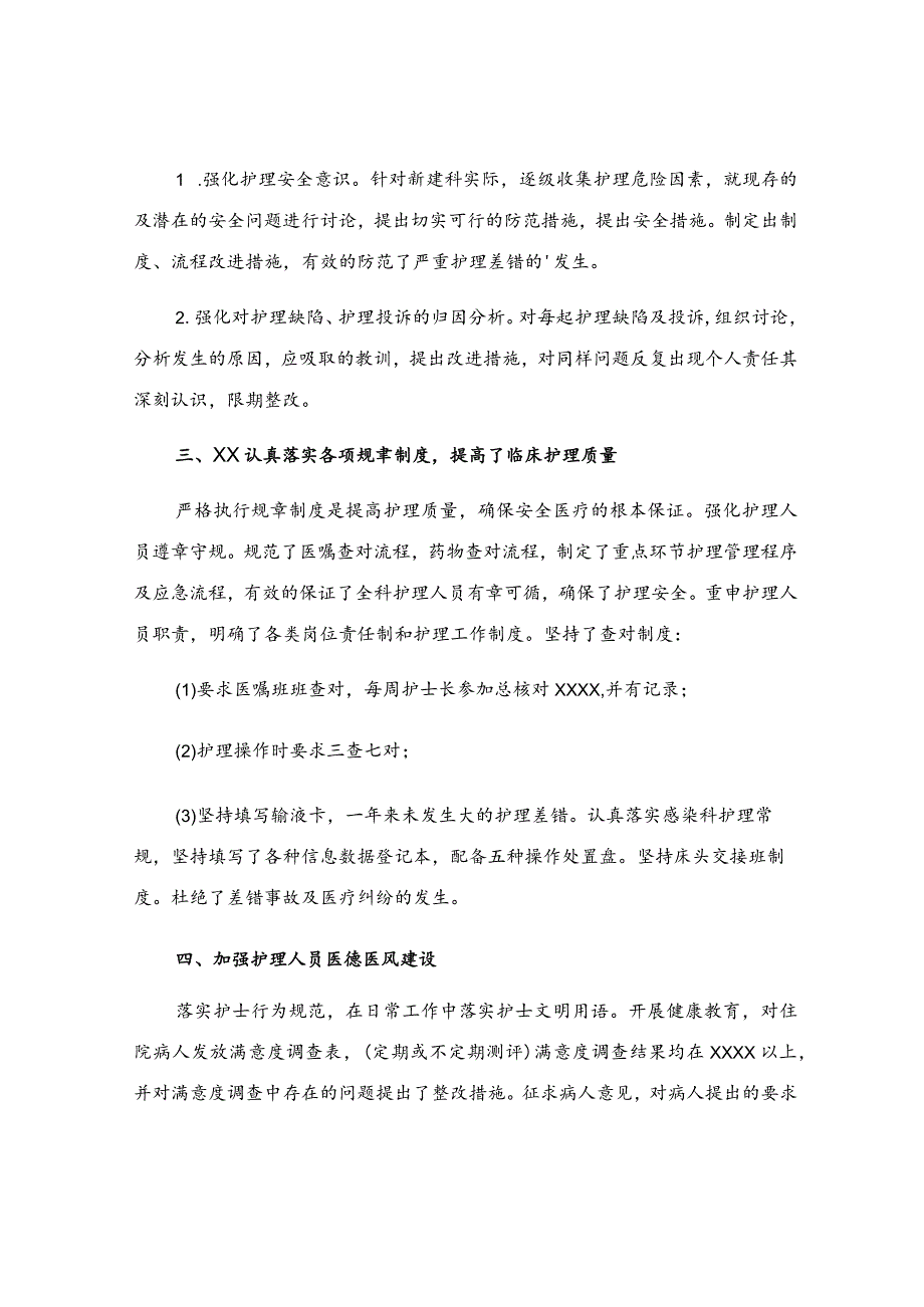2、技术操作考核,提高护理人员业务素质。XX坚持了护理业务查房,对护理诊断、护理措施进行了探讨,以达到提高业务素质的目的。(二)悉心指导新任护理人员工作。对新分配的护士进行岗前职业道德教育、规章制度、护士行为规范教育及护理基础知识、专科知识、护理技术操作培训。对新任护理人员采取跟班、指导与交流等形式,帮助新任护理人员尽快熟悉护理工作,在较短的时间内承担起护理工作任务。(三)加强了护理安全管理,保证护理安全1 .强化护理安全意识。针对新建科实际,逐级收集护理危险因素,就现存的及潜在的安全问题进行讨论,提出切实可行的防范措施,提出安全措施。制定出制度、流程改进措施,有效的防范了严重护理差错的发生。2.