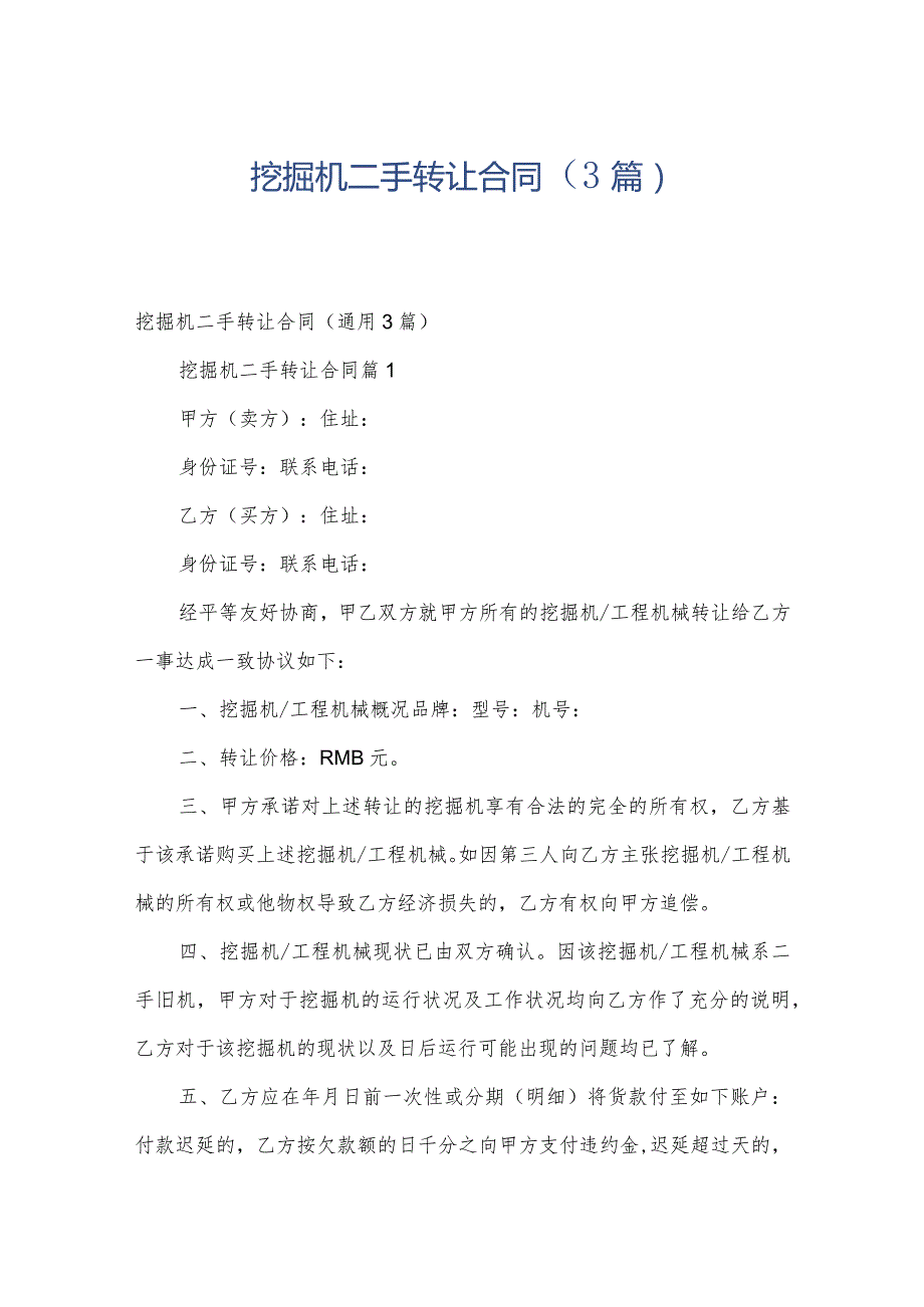 挖掘机二手转让合同(3篇).docx