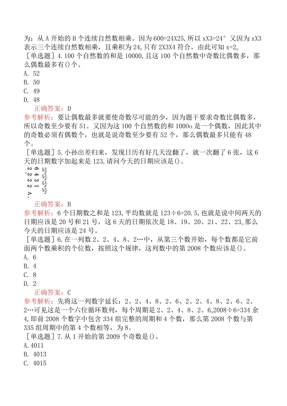 4、为:从A开始的B个连续自然数相乘。因为600=24X25,所以xX3=24又因为xX3表示三个连续自然数相乘,且乘积为24,只有2X3X4符合,由此可知x=2o单选题4.100个自然数的和是10000,且这100个自然数中奇数比偶数多,那么偶数最多有()个。A. 52B. 50C. 49D. 48正确答案:D参考解析:要让偶数最多就要使奇数尽可能的少,因为题干要求奇数比偶数多,所以奇数至少要有51。又因为这100个自然数的和100Oo是一个偶数,因此其中的奇数必须有偶数个,也就是说奇数至少要有52个,那么偶数最多只能有48个。单选题5.小孙出差归来,发现日历有好几天没翻了,就一次翻了6张,这6