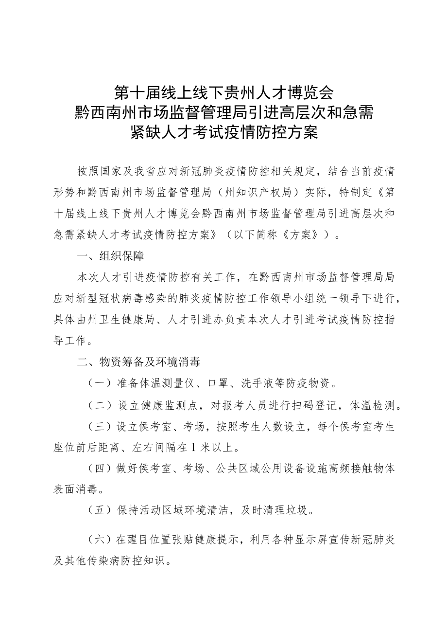 1、第十届线上线下贵州人才博览会黔西南州市场监督管理局引进高层次和急需紧缺人才考试疫情防控方案按照国家及我省应对新冠肺炎疫情防控相关规定,结合当前疫情形势和黔西南州市场监督管理局(州知识产权局)实际,特制定第十届线上线下贵州人才博览会黔西南州市场监督管理局引进高层次和急需紧缺人才考试疫情防控方案(以下简称方案)。一、组织保障本次人才引进疫情防控有关工作,在黔西南州市场监督管理局局应对新型冠状病毒感染的肺炎疫情防控工作领导小组统一领导下进行,具体由州卫生健康局、人才引进办负责本次人才引进考试疫情防控指导工作。二、物资筹备及环境消毒(一)准备体温测量仪、口罩、洗手液等防疫物资。(二)设立健康监测点,对