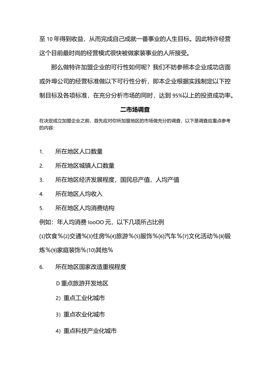 3、业里,使投资人预想的目标在很短的时间内,以最少的代价,最小的投资提前5至10年得到收益,从而完成自己成就一番事业的人生目标。因此特许经营这个目前最时尚的经营模式很快被做家装事业的人所接受。那么做特许加盟企业的可行性如何呢?我们不妨参照本企业成功店面或外埠公司的经营标准做以下可行性分析,即本企业根据实践制定以下控制目标及各项标准,在充分分析市场的同时,达到95%以上的投资成功率。二市场调查在决定成立加盟企业之前,首先应对你所加盟地区的市场做充分的调查,以下是调查应重点参考的内容:1. 所在地区人口数量2. 所在地区城镇人口数量3. 所在地区经济发展程度,国民总产值,人均产值4. 所在地区人均收入