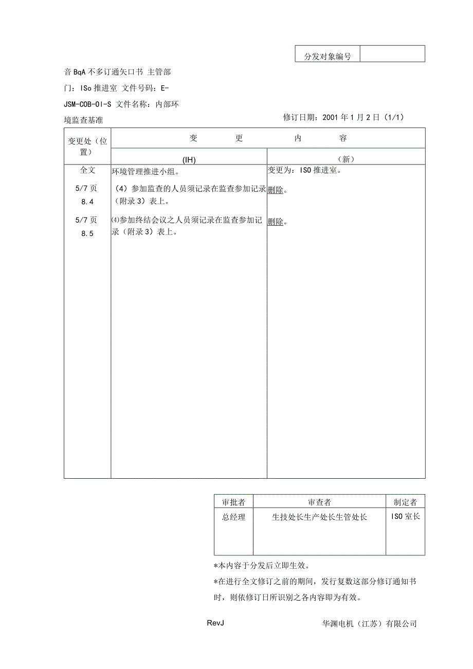 音BqA不多订通矢口书 主管部门:ISo推进室 文件号码:E-JSM-COB-Ol-S 文件名称:内部环境监查基准分发对象编号变更处(位置)变更内容(IH)(新)全文5/7页8.45/7页8.5环境管理推进小组。(4)参加监查的人员须记录在监查参加记录(附录3)表上。参加终结会议之人员须记录在监查参加记录(附录3)表上。变更为:ISO推进室。删除。删除。修订日期:2001年1月2日(1/1)审批者审查者制定者总经理生技处长生产处长生管处长ISO室长*本内容于分发后立即生效。*在进行全文修订之前的期间,发行复数这部分修订通知书时,则依修订日所识别之各内容即为有效。RevJ华渊电机(江苏)有限公司