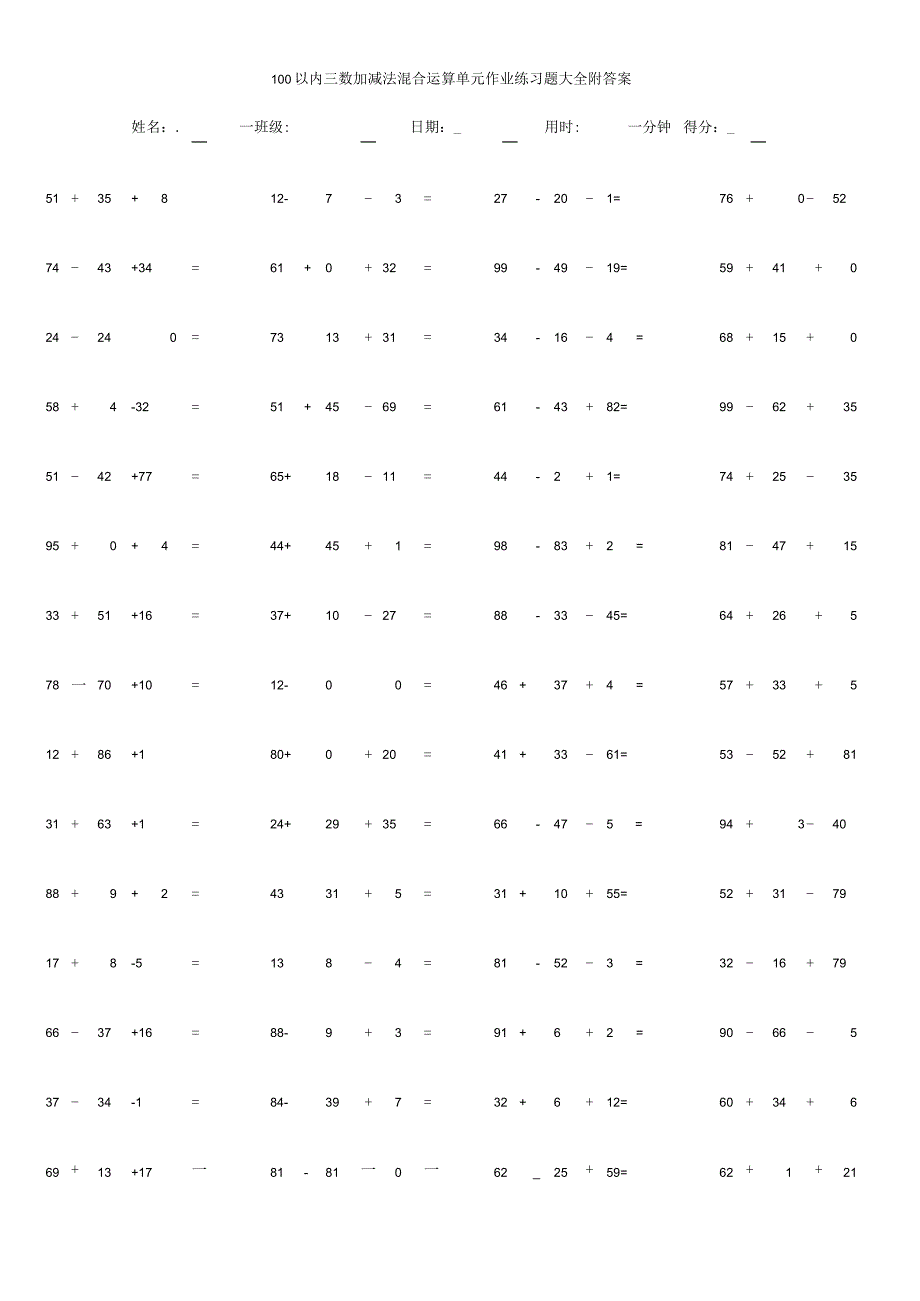 - 100 以内 加减法 混合 运算 单元 作业 练习题 大全 答案