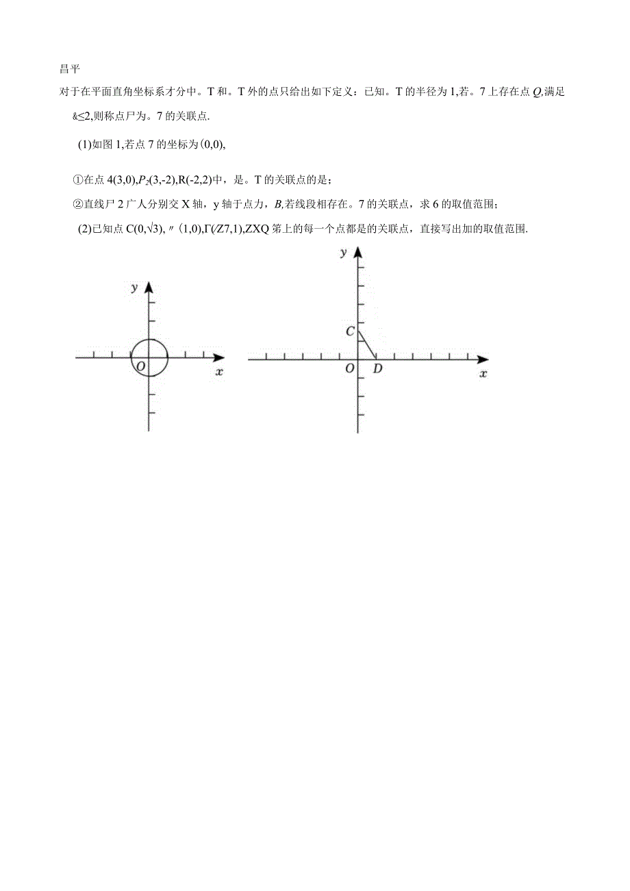 3、1,-3)中,线段觑V的“亲近点”的是点尸在直线y=l上,若点尸为线段JW的“亲近点”,则点尸的坐标为(2)若直线y=-5-3总存在线段蒯V的“亲近点”,则E的取值范围是.燕山在平面直角坐标系X0中,对于。和。C外一点P给出如下定义:连接交。于点作点/关于点。的对称点,若点、P在线段S上,则称点是。C的“关联点”.例如,图中尸为。的一个“关联点”.(1)。的半径为L如图1,在点A(f历,0),6(2,2),D(0,3)中,。的“关联点”是;已知点加在直线尸返12上,且点是。的“关联点”,求点时的横坐标力的取值范围.3(2)直线片=5(x-1)与X轴,y轴分别交于点,点尸,。7的圆心为7(,0)