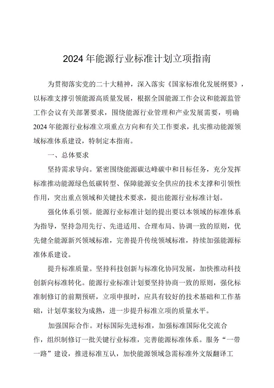 1、2024年能源行业标准计划立项指南为贯彻落实党的二十大精神,深入落实国家标准化发展纲要,以标准支撑引领能源高质量发展,根据全国能源工作会议和能源监管工作会议有关部署要求,围绕能源行业管理和产业发展需要,明确2024年能源行业标准立项重点方向和有关工作要求,扎实推动能源领域标准体系建设,特制定本指南。一、总体要求坚持需求导向。紧密围绕能源碳达峰碳中和目标任务,充分发挥标准推动能源绿色低碳转型、保障能源安全供应的技术支撑和引领性作用,突出重点领域和关键技术要求,提出能源行业标准计划。强化体系引领。能源行业标准计划的提出要以本领域的标准体系为指导,坚持急用先行、先进适用、合理布局、协调一致的原则,优