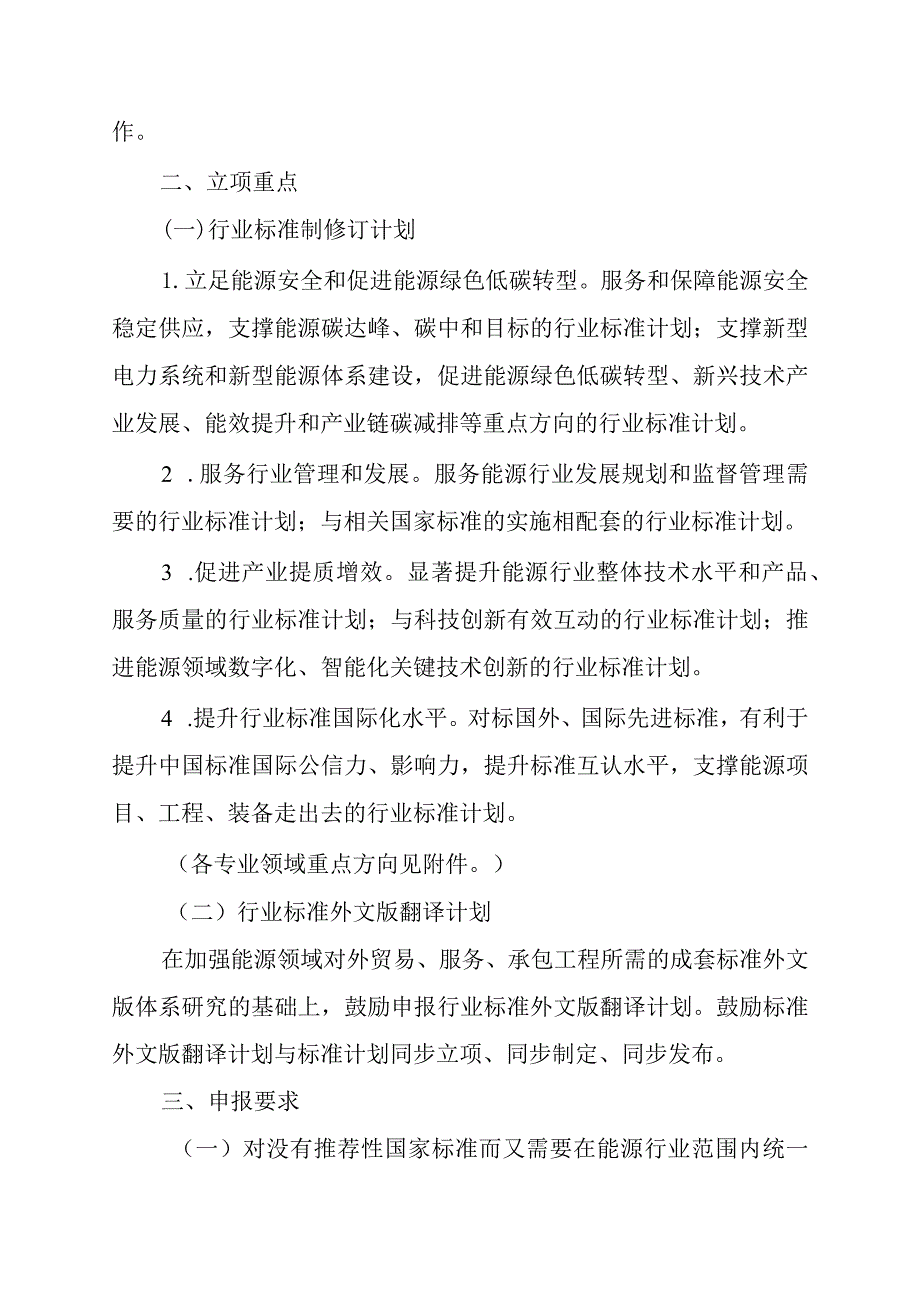 4、域重点方向见附件。)(二)行业标准外文版翻译计划在加强能源领域对外贸易、服务、承包工程所需的成套标准外文版体系研究的基础上,鼓励申报行业标准外文版翻译计划。鼓励标准外文版翻译计划与标准计划同步立项、同步制定、同步发布。三、申报要求(一)对没有推荐性国家标准而又需要在能源行业范围内统一的技术要求,提出能源行业标准计划。属于竞争性的、一般性的技术要求,原则上不作为能源行业标准计划。(一)应按照现有标准管理分工机制和专业领域,经过充分调研、技术论证和初步筛选后确定申报计划。(三)申报计划应保证与现有标准体系协调一致。存在技术交叉的领域,申报单位应在计划上报前与技术相关方充分沟通协商,避免交叉重复立项