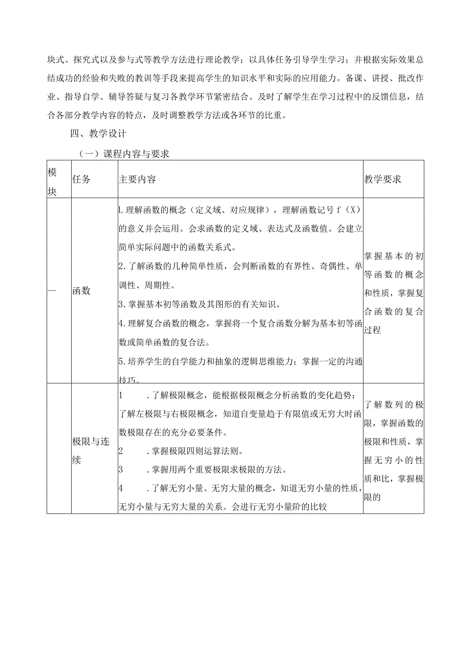 6、教学;以具体任务引导学生学习;并根据实际效果总结成功的经验和失败的教训等手段来提高学生的知识水平和实际的应用能力。备课、讲授、批改作业、指导自学、辅导答疑与复习各教学环节紧密结合。及时了解学生在学习过程中的反馈信息,结合各部分教学内容的特点,及时调整教学方法或各环节的比重。四、教学设计(一)课程内容与要求模块任务主要内容教学要求函数L理解函数的概念(定义域、对应规律),理解函数记号f(X)的意义并会运用。会求函数的定义域、表达式及函数值。会建立简单实际问题中的函数关系式。2 .了解函数的几种简单性质,会判断函数的有界性、奇偶性、单调性、周期性。3 .掌握基本初等函数及其图形的有关知识。4 .理