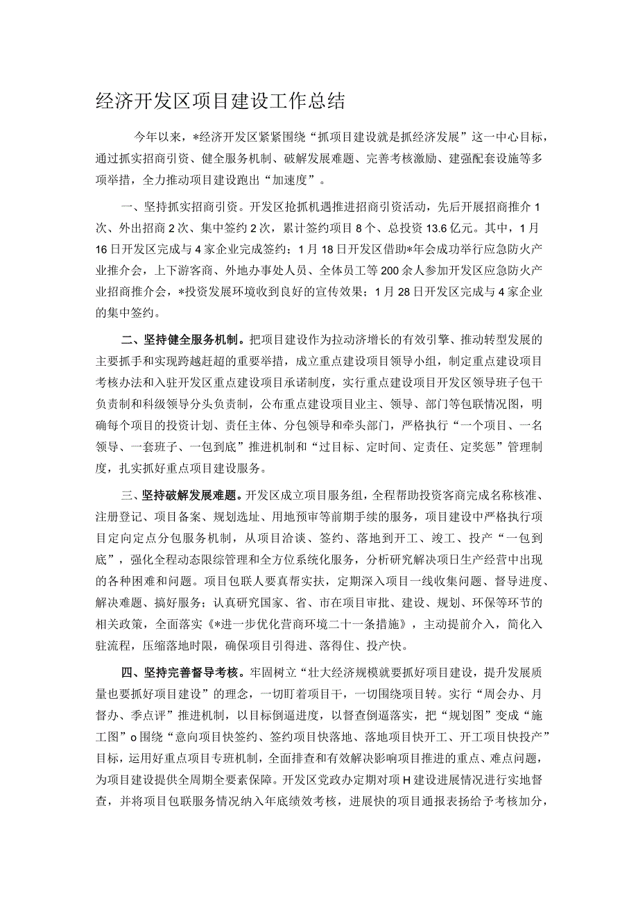 1、经济开发区项目建设工作总结今年以来,*经济开发区紧紧围绕“抓项目建设就是抓经济发展”这一中心目标,通过抓实招商引资、健全服务机制、破解发展难题、完善考核激励、建强配套设施等多项举措,全力推动项目建设跑出“加速度”。一、坚持抓实招商引资。开发区抢抓机遇推进招商引资活动,先后开展招商推介1次、外出招商2次、集中签约2次,累计签约项目8个、总投资13.6亿元。其中,1月16日开发区完成与4家企业完成签约;1月18日开发区借助*年会成功举行应急防火产业推介会,上下游客商、外地办事处人员、全体员工等200余人参加开发区应急防火产业招商推介会,*投资发展环境收到良好的宣传效果;1月28日开发区完成与4家企