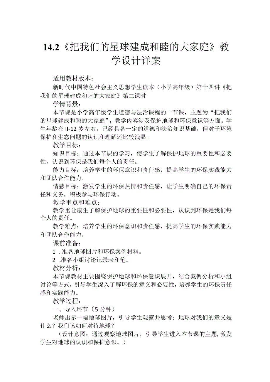 1、14.2把我们的星球建成和睦的大家庭教学设计详案适用教材版本:新时代中国特色社会主义思想学生读本(小学高年级)第十四讲把我们的星球建成和睦的大家庭第二课时学情背景:本节课是小学高年级学生道德与法治课程的一节课,主题为“把我们的星球建成和睦的大家庭”,教学内容涉及保护地球和环保意识等方面。学生年龄在II-12岁左右,已经具备一定的道德和法治知识基础,但对于环境保护和生态问题的认识和理解还比较浅显。教学目标:知识目标:通过本节课的学习,使学生了解保护地球的重要性和必要性,认识到环保是我们每个人的责任。能力目标:培养学生的环保意识和责任感,提高学生的环保实践能力和团队合作能力。情感目标:激发学生的环