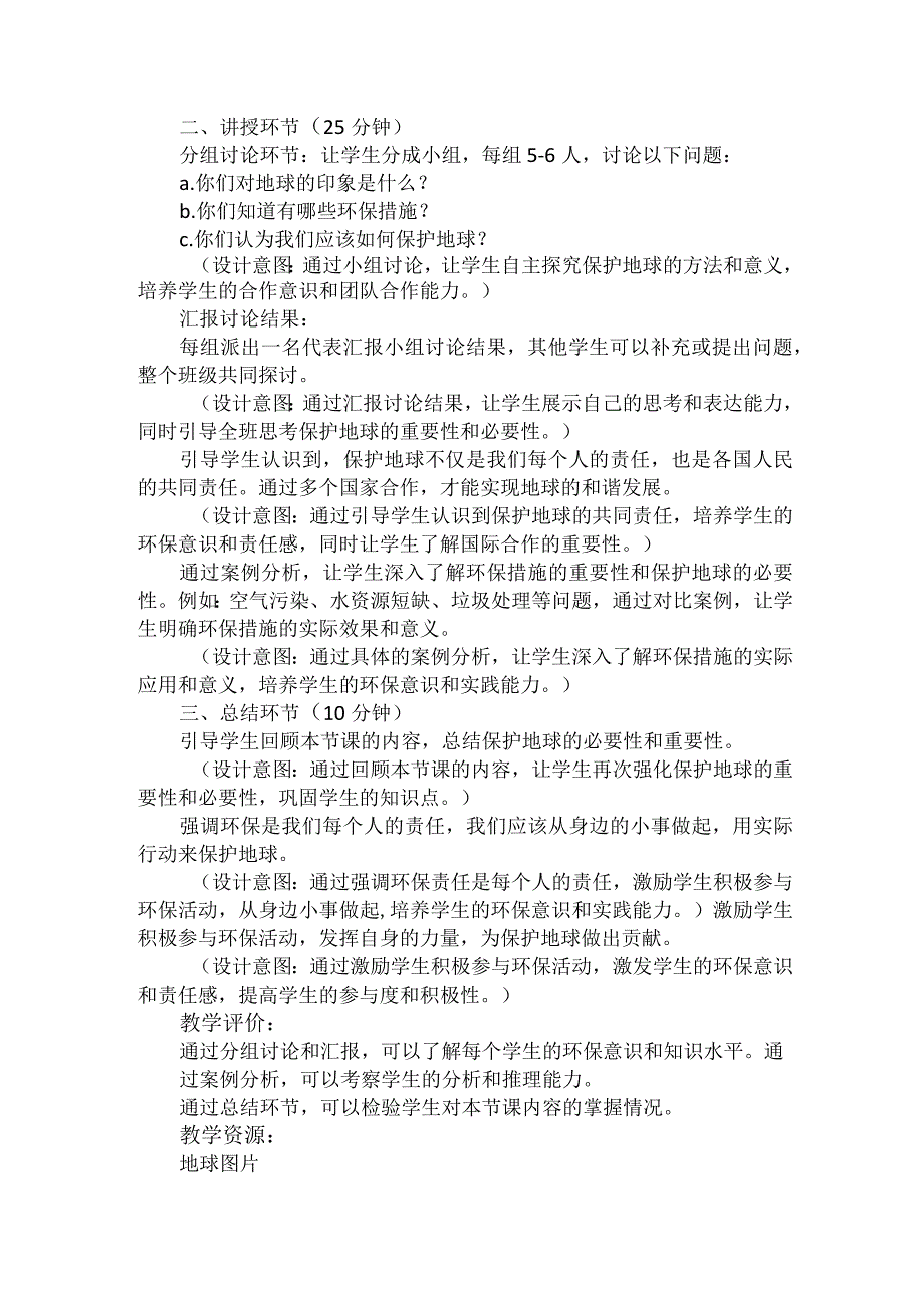 3、,引导学生进入本节课的主题,激发学生对地球的认识和保护意识。)二、讲授环节(25分钟)分组讨论环节:让学生分成小组,每组5-6人,讨论以下问题:a.你们对地球的印象是什么?b.你们知道有哪些环保措施?c.你们认为我们应该如何保护地球?(设计意图:通过小组讨论,让学生自主探究保护地球的方法和意义,培养学生的合作意识和团队合作能力。)汇报讨论结果:每组派出一名代表汇报小组讨论结果,其他学生可以补充或提出问题,整个班级共同探讨。(设计意图:通过汇报讨论结果,让学生展示自己的思考和表达能力,同时引导全班思考保护地球的重要性和必要性。)引导学生认识到,保护地球不仅是我们每个人的责任,也是各国人民的共同责
