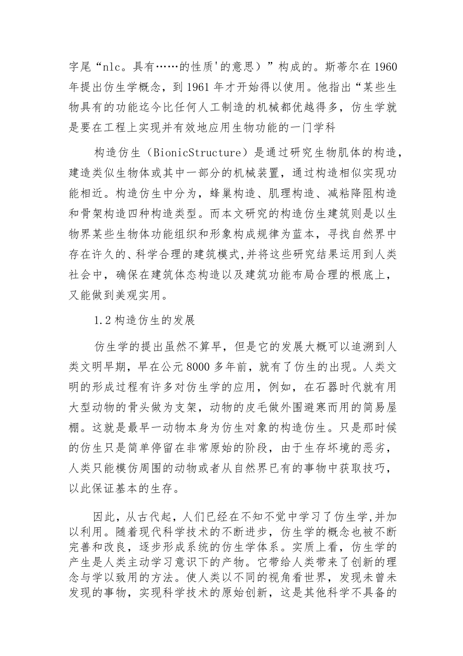 2、社会在蓬勃发展,人们早已不再满足于吃饱穿暖的阶段,对物质和审美的需求日渐高涨,建筑的意义不再只是单纯的遮风挡雨,同时还得兼具美观与实用价值。因此,构造仿生在大跨度建筑设计中的重要性不言而喻。本文首先从构造仿生和大跨度建筑设计两方面入手,通过查阅整理,对构造仿生的概念、构造仿生的发展和构造仿生的科学根底理论开展系统的研究,总结出构造仿生的方法和应用特征。然后概括大跨度建筑的构造设计特点,结合相应的案例开展分析,最后得出结论,并就这一结论对构造仿生在大跨度建组设计中的应用提出改良意见。1构造仿生1.l构造仿生的概念了解构造仿生的概念,首先要先了解仿生学的概念。仿生学一词是由美国斯蒂尔根据拉丁文“b