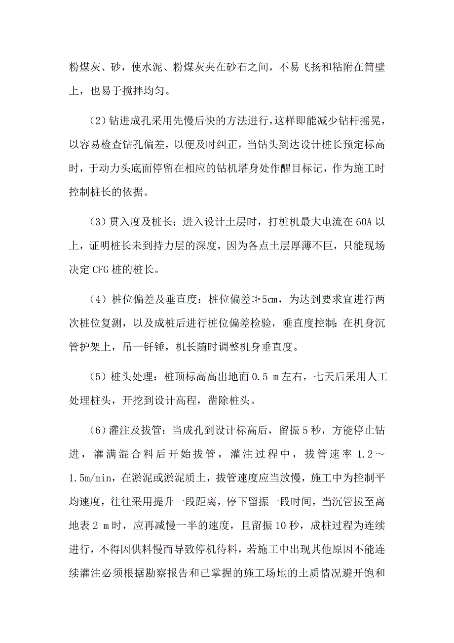 4、室平行试验并批准后使用,拌和料配合比经试配确定,投料计量,搅拌按规定时间进行,每次搅拌60秒以上,每天检验坍落度,坍落度控制在120-160,并做试块,试块强度等级均大于设计要求。搅拌时严格按配合比进行配料,上料顺序为先装碎石,再加水泥、粉煤灰、砂,使水泥、粉煤灰夹在砂石之间,不易飞扬和粘附在筒壁上,也易于搅拌均匀。(2)钻进成孔采用先慢后快的方法进行,这样即能减少钻杆摇晃,以容易检查钻孔偏差,以便及时纠正,当钻头到达设计桩长预定标高时,于动力头底面停留在相应的钻机塔身处作醒目标记,作为施工时控制桩长的依据。(3)贯入度及桩长:进入设计土层时,打桩机最大电流在60A以上,证明桩长未到持力层的深