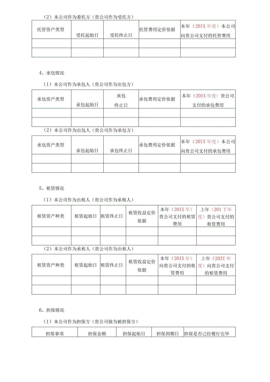 2、会计师事务所(特殊普通合伙)。回函地址:邮编:电话:传真:联系人:注:本询证函除特别注明外,金额单位为人民币元。1、本公司向贵公司采购货物/接受贵公司提供劳务期间发生金额定价原则本年度(20IX年度)上年度(20IY年度)2、本公司向贵公司销售商品/提供贵公司劳务期间发生金额定价原则本年度(2(HX年度)上年度(2(HY年度)3、托管情况(1)本公司作为受托方(贵公司作为委托方)托管资产类型受托起始日受托终止日托管费用定价依据木年(20IX年度)贵公司支付的托管费用(2)本公司作为委托方(贵公司作为受托方)托管资产类型受托起始日受托终止日托管费用定价依据本年(20IX年度)本公司向贵公司支付的