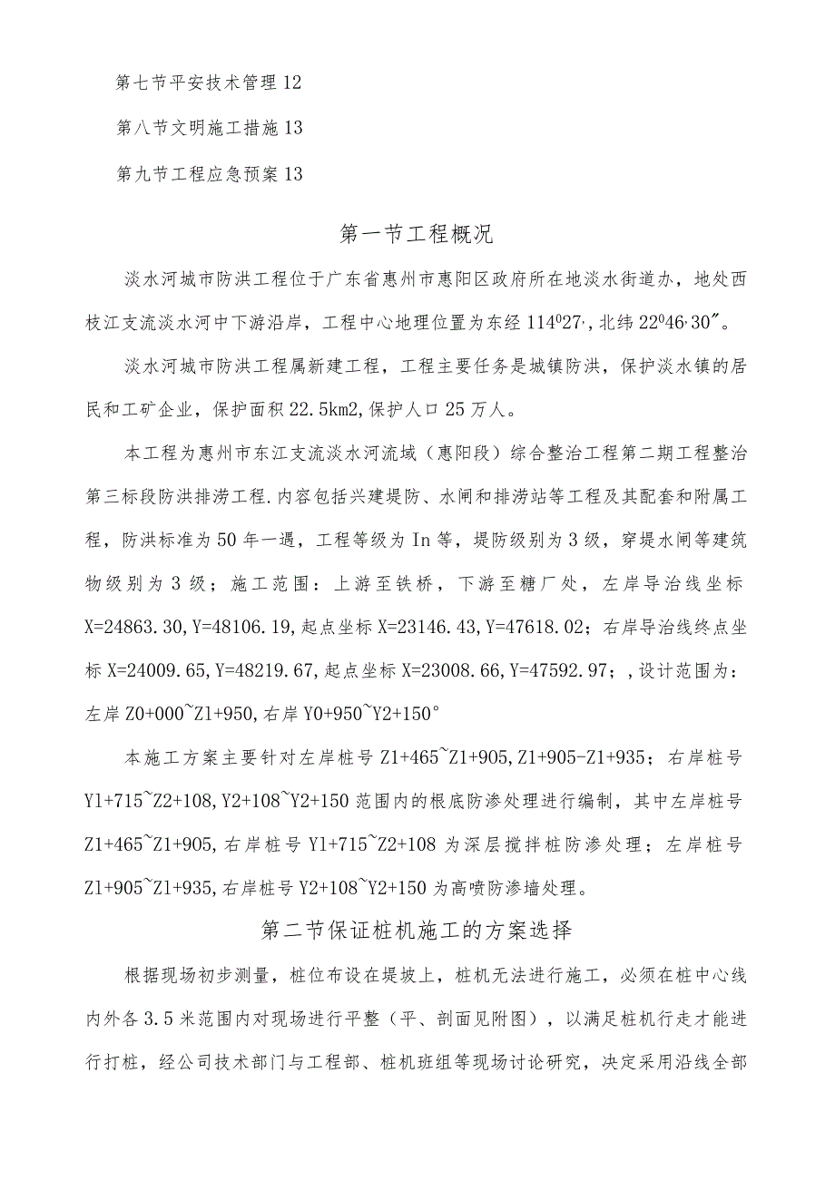 3、坐标X=23146.43,Y=47618.02;右岸导治线终点坐标X=24009.65,Y=48219.67,起点坐标X=23008.66,Y=47592.97;,设计范围为:左岸Z0+000Zl+950,右岸Y0+950Y2+150本施工方案主要针对左岸桩号Z1+465Z1+9O5,Z1+905-Z1+935;右岸桩号Yl+715Z2+108,Y2+108Y2+150范围内的根底防渗处理进行编制,其中左岸桩号Z1+465Z1+9O5,右岸桩号Yl+715Z2+108为深层搅拌桩防渗处理;左岸桩号Zl+905Zl+935,右岸桩号Y2+108Y2+150为高喷防渗墙处理。第二节保证桩机施工的方