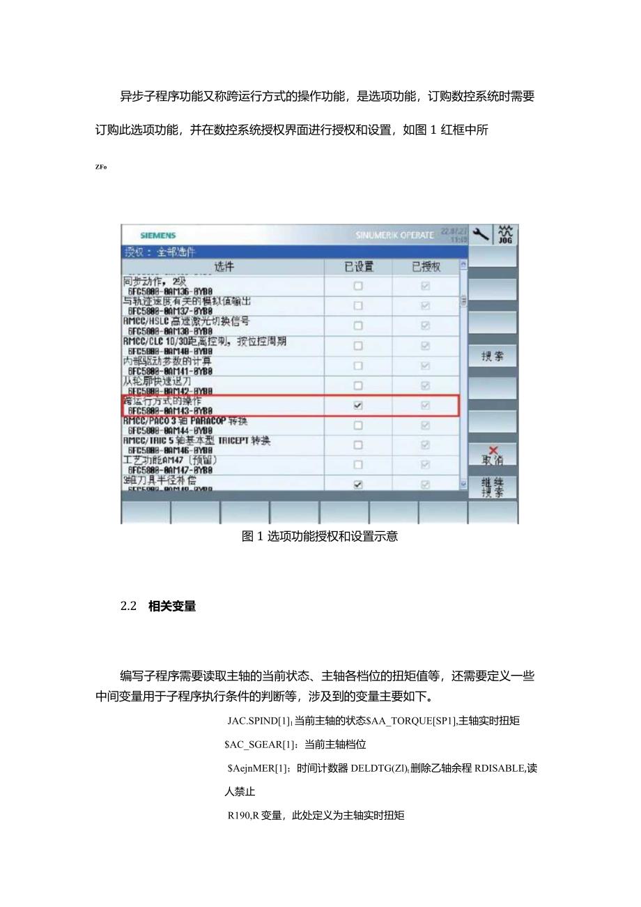 3、能授权和设置示意2.2 相关变量编写子程序需要读取主轴的当前状态、主轴各档位的扭矩值等,还需要定义一些中间变量用于子程序执行条件的判断等,涉及到的变量主要如下。JAC.SPIND11当前主轴的状态$AA_TORQUESP1,主轴实时扭矩$AC_SGEAR1:当前主轴档位$AejnMER1;时间计数器DELDTG(Zl)t删除乙轴余程RDISABLE,读人禁止R190,R变量,此处定义为主轴实时扭矩R191lR变最,主轴低档时的扭矩极限值R192;R变量,主轴高档时的扭矩极限值R193,R变量,主轴的扭矩极限值R194lR变量,主轴超扭矩标志位2.3 程序编写异步子程序激活的同步动作在零件程序的