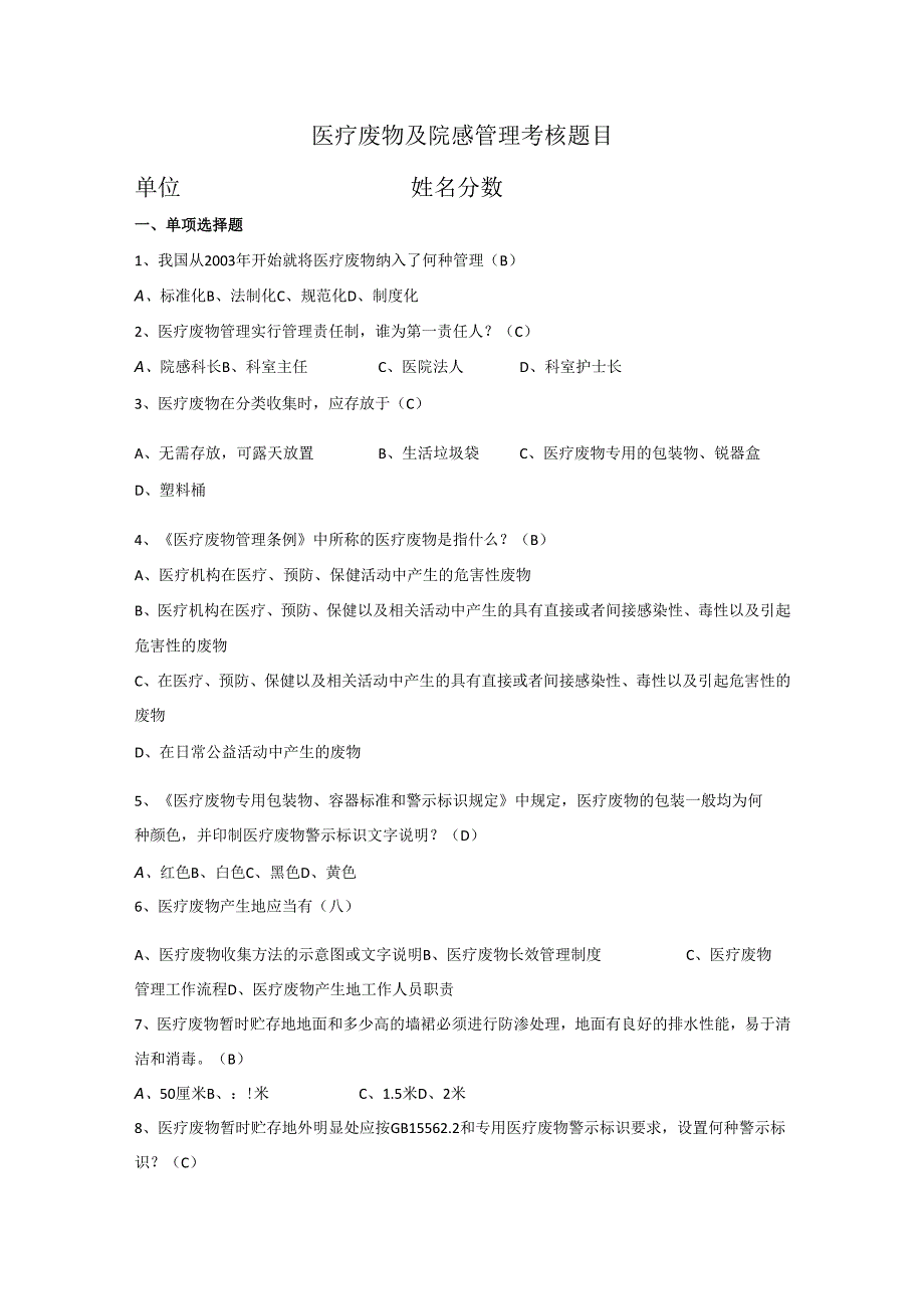 1、医疗废物及院感管理考核题目单位姓名分数一、单项选择题1、我国从2003年开始就将医疗废物纳入了何种管理(B)A、标准化B、法制化C、规范化D、制度化2、医疗废物管理实行管理责任制,谁为第一责任人?(C)A、院感科长B、科室主任C、医院法人D、科室护士长3、医疗废物在分类收集时,应存放于(C)A、无需存放,可露天放置B、生活垃圾袋C、医疗废物专用的包装物、锐器盒D、塑料桶4、医疗废物管理条例中所称的医疗废物是指什么?(B)A、医疗机构在医疗、预防、保健活动中产生的危害性废物B、医疗机构在医疗、预防、保健以及相关活动中产生的具有直接或者间接感染性、毒性以及引起危害性的废物C、在医疗、预防、保健以及
