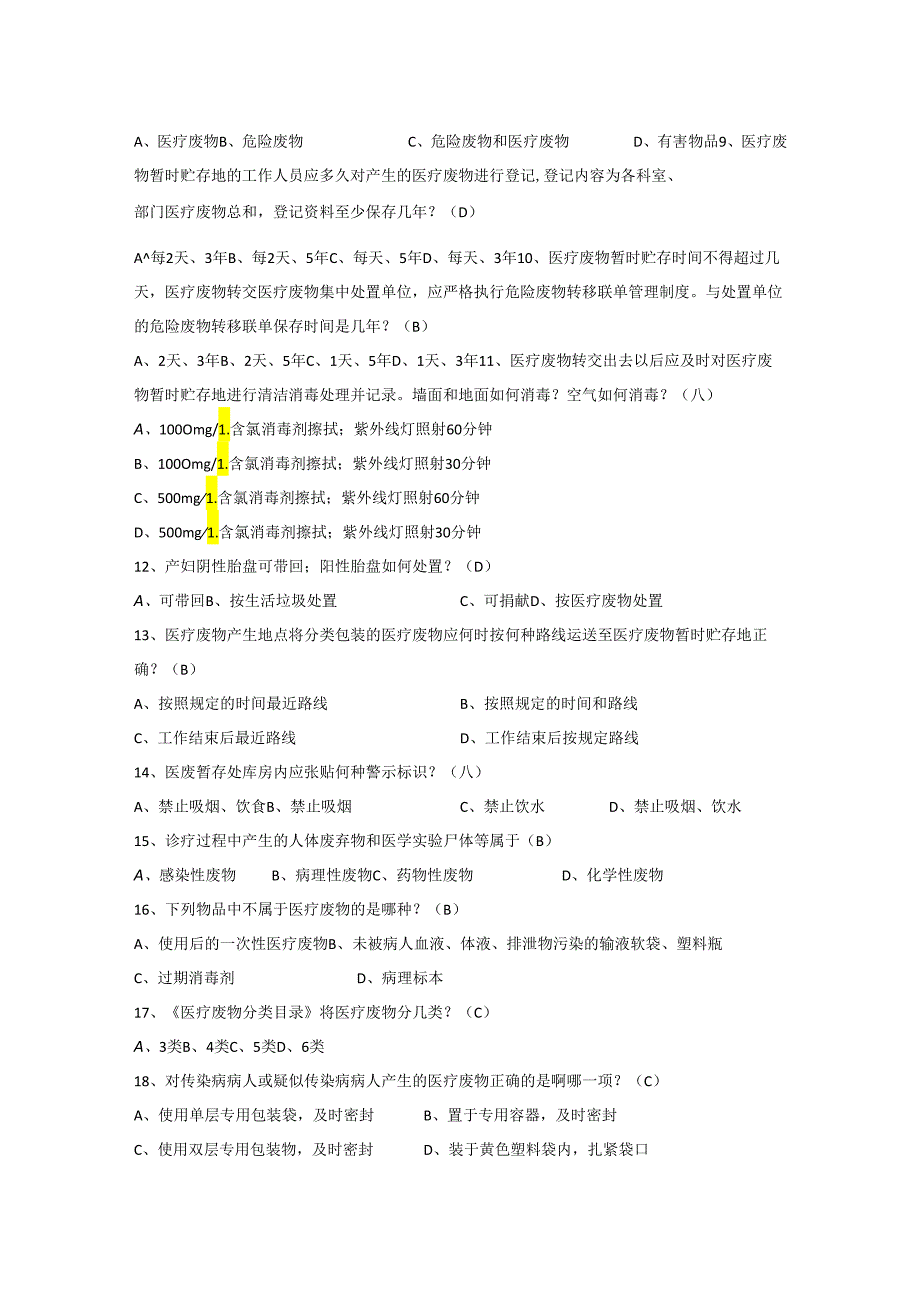 4、空气如何消毒?(八)A、100Omg/1.含氯消毒剂擦拭;紫外线灯照射60分钟B、100Omg/1.含氯消毒剂擦拭;紫外线灯照射30分钟C、500mg1.含氯消毒剂擦拭;紫外线灯照射60分钟D、500mg1.含氯消毒剂擦拭;紫外线灯照射30分钟12、产妇阴性胎盘可带回;阳性胎盘如何处置?(D)A、可带回B、按生活垃圾处置C、可捐献D、按医疗废物处置13、医疗废物产生地点将分类包装的医疗废物应何时按何种路线运送至医疗废物暂时贮存地正确?(B)A、按照规定的时间最近路线B、按照规定的时间和路线C、工作结束后最近路线D、工作结束后按规定路线14、医废暂存处库房内应张贴何种警示标识?(八)A、禁止吸烟