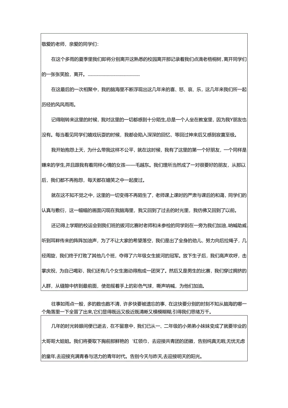 6、共青团的团徽,告别纯真无暇,无忧无虑的童年,去迎接充满青春与活力的青年时代。告别今天与昨天,去迎接明天的阳光。别了,六(3),这让我变得懂事,学会拼搏的地方。别了,敬爱的老师,谢谢您让我学会了分享;谢谢您让我学会了勇敢;谢谢您让我学会了做人。您的恩情于教诲,我都将铭记在心。别了,我亲爱的朋友,谢谢你们让我学会了珍惜,给了我一份真挚的友谊,用你的阳光照亮了处在阴影中的我请别忘了我们在老梧桐树下的誓言不论天地怎样变我们的友谊依旧不变,不论身在何地,也无论再过多长时间,我们的友谊永不变质!别了,记录着我这几个春秋点滴的校园,别了,我心中这片圣洁的土地!小学毕业发言稿3敬爱的老师,亲爱的同学们:大家好