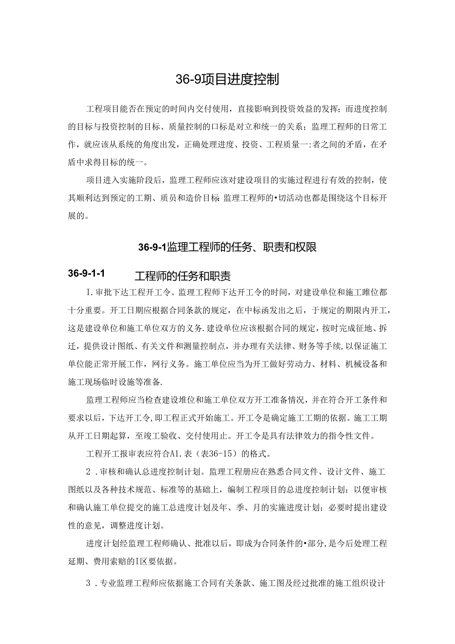 1、36-9项目进度控制工程项目能否在预定的时间内交付使用,直接影响到投资效益的发挥;而进度控制的目标与投资控制的目标、质量控制的口标是对立和统一的关系;监理工程师的日常工作,就应该从系统的角度出发,正确处理进度、投资、工程质量一:者之间的矛盾,在矛盾中求得目标的统一。项目进入实施阶段后,监理工程师应该对建设项目的实施过程进行有效的控制,使其顺利达到预定的工期、质员和造价目标:监理工程师的切活动也都是围绕这个目标开展的。36-9-1监理工程师的任务、职责和权限36-9-1-1工程师的任务和职责I.审批下达工程开工令。监理工程师下达开工令的时间,对建设单位和施工雎位都十分重要。开工日期应根据合同条款