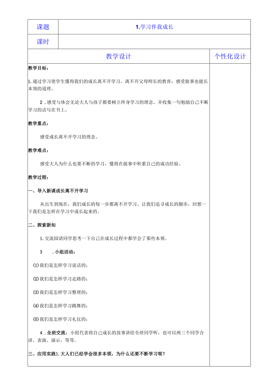 1、道法教学设计班级:教师:至年秋期课题1.学习伴我成长课时教学设计个性化设计教学目标:1.通过学习使学生懂得我们的成长离不开学习,离不开父母师长的教育;感受做事也能长本领的道理。2 .感受与体会无论大人与孩子都要树立终身学习的理念,并收集一句勉励自己不断学习的话写在书上。教学重点:感受成长离不开学习的理念。教学难点:感受大人为什么也要不断的学习,懂得在做事中积累自己的成功经验。教学过程:一、导入新课成长离不开学习从出生到现在,我们成长的每一步都离不开学习。让我们追寻成长的脚步,回想一下我们是怎样在学习中成长起来的。二、探索新知1.交流园请同学思考一下自己在成长过程中都学会了那些本领。3 .小组活
