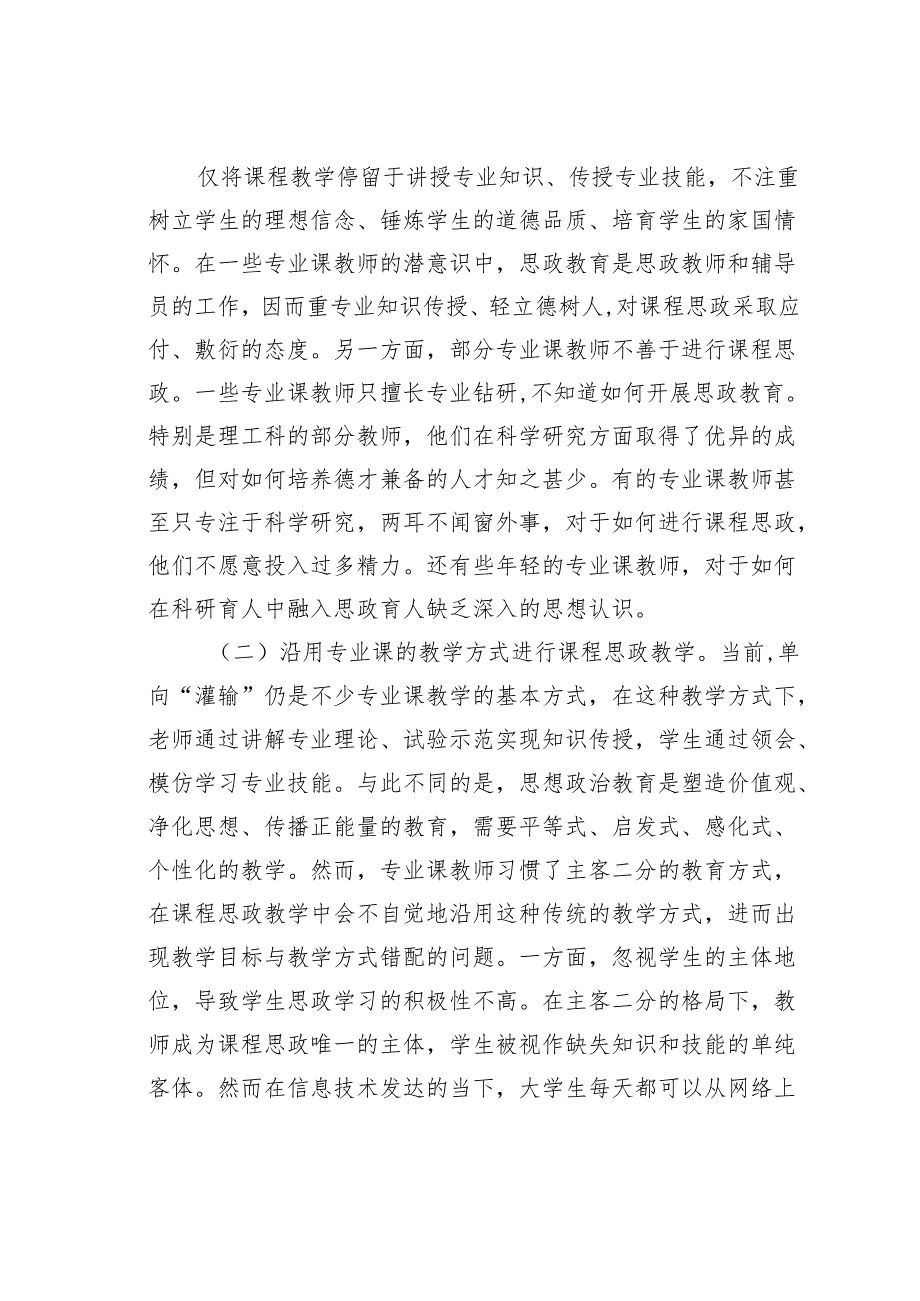 2、都要结合课程特点融入思政元素,专业课教师也将思政内容写进了教案、编进了教学课件。然而,不少教师的课程思政停留于表面,流于形式,距离落到实处、充分发挥育人实效还有一定距离。一方面,部分专业课教师的思想认识有待转变。在“大思政”背景下,专业课教师要肩负起培育时代新人的使命,不仅要进行价值引领,而且要传播思想、塑造灵魂。然而,一些专业课教师专注于学术研究和专业知识的传授,仅将课程教学停留于讲授专业知识、传授专业技能,不注重树立学生的理想信念、锤炼学生的道德品质、培育学生的家国情怀。在一些专业课教师的潜意识中,思政教育是思政教师和辅导员的工作,因而重专业知识传授、轻立德树人,对课程思政采取应付、敷衍的