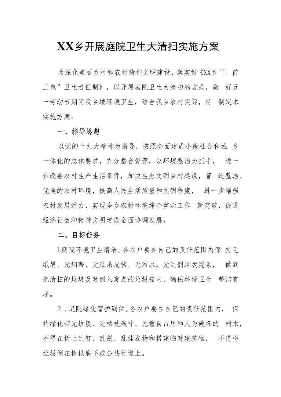 1、XX乡开展庭院卫生大清扫实施方案为深化美丽乡村和农村精神文明建设,落实好XX乡门 前三包”卫生责任制,以开展庭院卫生大清扫的方式,做 好五一劳动节期间我乡域环境卫生,结合我乡农村实际,特 制定本实施方案:一、指导思想以党的十九大精神为指导,按照全面建成小康社会和城 乡一体化的总体要求,充分整合资源,以环境整治为抓手, 进一步改善农村生产生活条件,加快生态文明乡村建设,营 造整洁、优美的农村环境,提高人民生活质量和文明程度, 进一步增强农村发展活力,实现全乡农村环境综合整治工作 新突破,促进经济社会和精神文明建设全面协调发展。二、目标任务L庭院环境卫生清洁。各农户要在自己的责任范围内保 持无纸屑