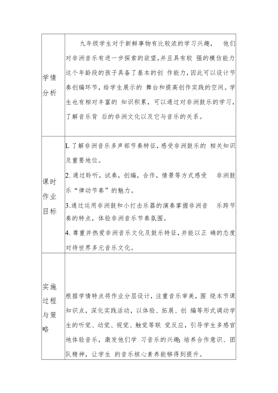 1、非洲鼓乐音乐教学作业设计学段:九年级 学科:音乐单课时作业设计课时 标题非洲鼓乐课 标 要 求义务教育艺术课程标准(2022年版)明确指 出:以立德树人为根本任务,培育和践行社会主义 核心价值观,引领学生在健康向上的审美实践中感 知、体验与理解艺术,逐步提高感受美、欣赏美、表 现美、创造美的能力,领略世界音乐文化的多样性, 包容不同音乐的表达方式,尊重文化差异。课时 内容 分析本节课选自人民音乐出版社九年级下册第四单 元非洲灵感之非洲鼓乐。本课以鼓乐为主, 了解非洲音乐节奏的特点一一跨节奏。鼓乐是加 纳共和国阿散地部落的一段鼓乐曲。通过欣赏分析 作品,提高学生的音乐审美感知,并通过创编节奏 等