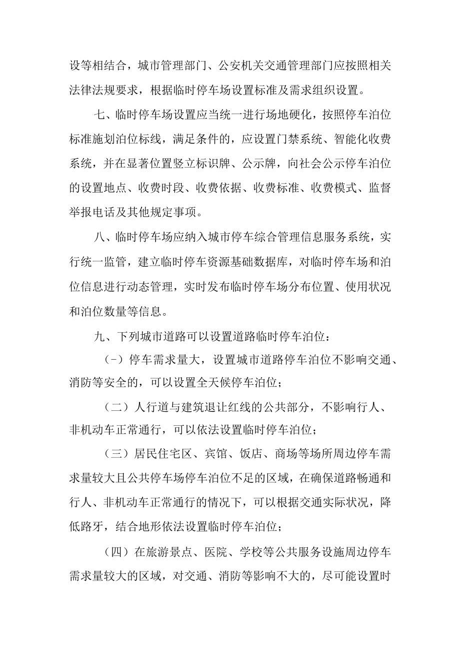 3、规定事项。八、临时停车场应纳入城市停车综合管理信息服务系统,实行统一监管,建立临时停车资源基础数据库,对临时停车场和泊位信息进行动态管理,实时发布临时停车场分布位置、使用状况和泊位数量等信息。九、下列城市道路可以设置道路临时停车泊位:(-)停车需求量大,设置城市道路停车泊位不影响交通、消防等安全的,可以设置全天候停车泊位;(二)人行道与建筑退让红线的公共部分,不影响行人、非机动车正常通行,可以依法设置临时停车泊位;(三)居民住宅区、宾馆、饭店、商场等场所周边停车需求量较大且公共停车场停车泊位不足的区域,在确保道路畅通和行人、非机动车正常通行的情况下,可以根据交通实际状况,降低路牙,结合地形依法