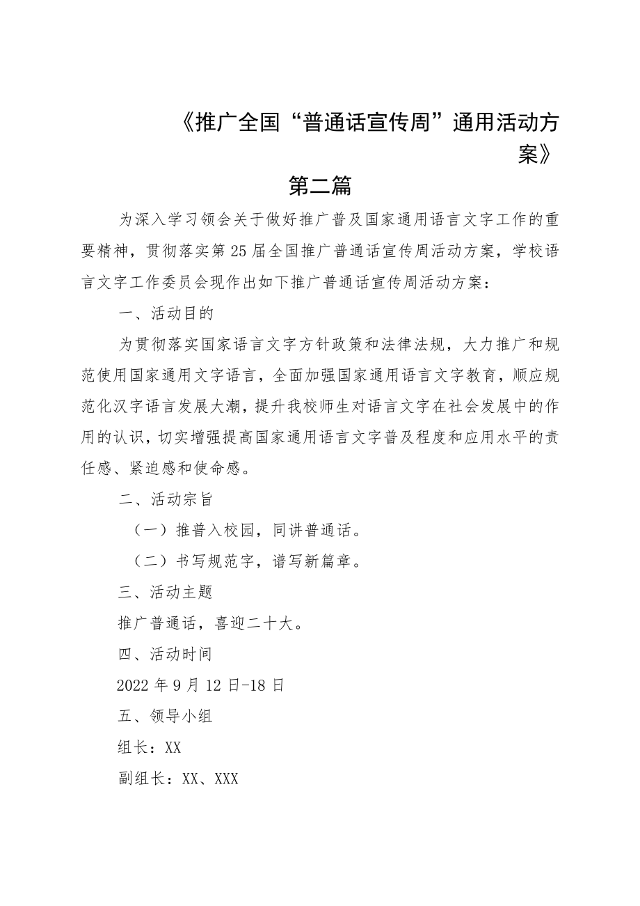 1、2022年推广普通话宣传周实施方案五篇第一篇今年9月13日至9月18日为全国第25届推广普通话宣传周。为更好落实中华人民共和国国家通用语言文字法,大力推广普通话,进一步提高我校师幼、家长运用国家通用语言文字的能力,弘扬中华优秀文化传统,提升学校文化品位,营造良好的语言环境,特制定本活动方案,具体内容如下:一、指导思想:全面、深入宣传国家语言文字法规政策,积极引导全园教职员工树立科学的语言观,扎实提高师幼说普通话,用规范字的意识与能力,提高道德水平和文化品位,共筑语言文字中国梦。三、活动时间:2022年9月139月18日三、活动主题:推广普通话,喜迎二十大四、活动目的:通过本次推普周活动,进一步