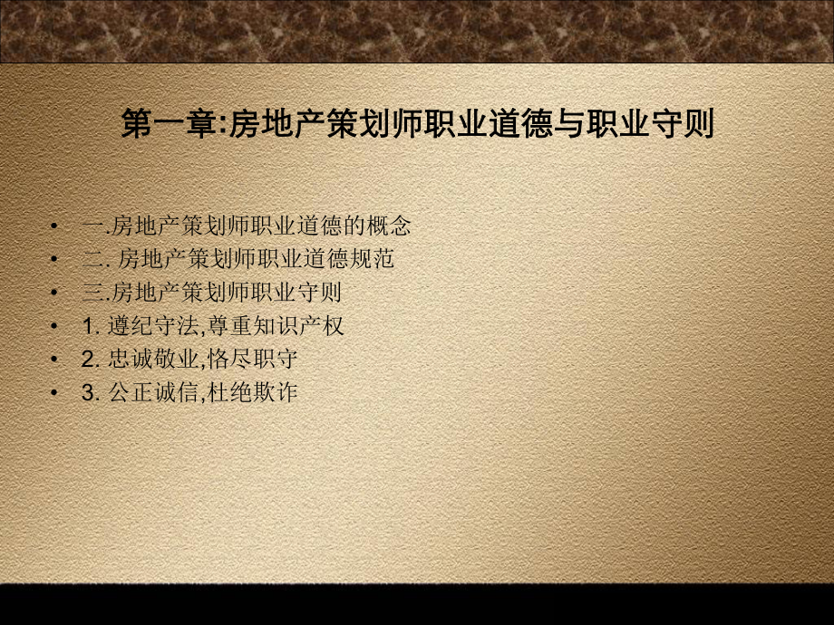 1、房地产策划师(基础知识)房地产策划师(基础知识)目录目录CHAPTER1. 职业道德房地产策划知识职业道德房地产策划知识CHAPTER2.房地产策划知识房地产策划知识CHAPTER3. 相关法律法规知识相关法律法规知识第一章第一章:房地产策划师职业道德与职业守则房地产策划师职业道德与职业守则一.房地产策划师职业道德的概念二. 房地产策划师职业道德规范三.房地产策划师职业守则1. 遵纪守法,尊重知识产权2. 忠诚敬业,恪尽职守3. 公正诚信,杜绝欺诈房地产策划师职业的基本知识结构房地产策划师职业的基本知识结构1. 企业策划知识2.房地产经济知识3.市场营销知识4.项目管理知识5.城市规划及建筑设