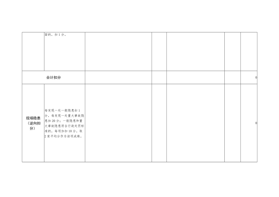 工商贸企业安全监管情况检查细则检查内容检查细则A企业:扣分B企业:扣分平均扣分全要素隐患整改每有一条隐患未整改的,扣1分。未整改隐患分别是:1.未整改隐患分别是:O风险点管控措施制定每有一个风险点未制定管控措施的,扣1分。O一网卡”推广应用情况查看“一岗一卡”落实情况,内容应包括岗位主体责任、应知应会(含岗位操作规程、岗位风险点)、应急处置等。未制定“一岗一卡”的,扣2分;内容不全O面的,扣1分。合计扣分0现场隐患(逆向扣分)每发现一处一般隐患扣1分,每发现一处重大事故隐患扣20分;一般隐患和重大事故隐患符合行政处罚标准的,每项加扣10分。取2家平均分作为该项成绩。0