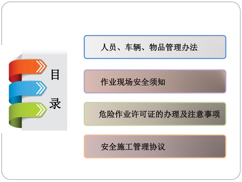 2、协助施工人员须由对口部门协助到到行政部办理登记,并将花名册交由安委会登记行政部办理登记,并将花名册交由安委会登记备案。(备案。(办办理登记需理登记需携带身份证复印件及个人一寸照片一张)在离开携带身份证复印件及个人一寸照片一张)在离开公司时需将厂牌交回保安室或对口部门负责人。公司时需将厂牌交回保安室或对口部门负责人。2 2、如未办理临时厂牌,进入厂区需在保安室进行登记、如未办理临时厂牌,进入厂区需在保安室进行登记,保安电话保安电话通知场内相关人员确认后进入(如不熟悉场内通知场内相关人员确认后进入(如不熟悉场内环境及路线由专人前来门卫带领环境及路线由专人前来门卫带领)离开)离开公司时需由受访公司时