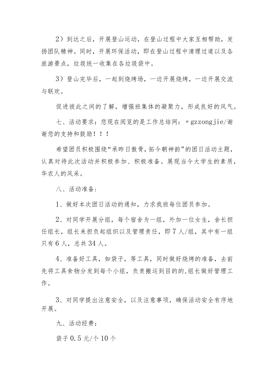 2、,开展交流活动。这个活动主要是大家一边烧烤,一边交流工作心得,在交流活动过程中大家畅所欲言,谈谈今后自己的努力方向,与此同时,开展游戏互动,来增进友谊,从而进一步到达增加团组织凝聚力的目的。六、活动主要流程:1)早晨7点30全班同学一起到校门口集合,各组长组织好组员准时到,然后座地铁到大夫山。2)到达之后,开展登山运动,在登山过程中大家互相帮助,发扬团队精神。同时,开展环保活动,即在登山过程中清理过道以及各旅游景点,垃圾统一收集在各垃圾袋中。3)登山完毕后,一起到烧烤场,一边开展烧烤,一边开展交流与联欢。促进彼此之间的了解,增强班集体的凝聚力,形成良好的风气。七、活动要求:您现在阅览的是工作总
