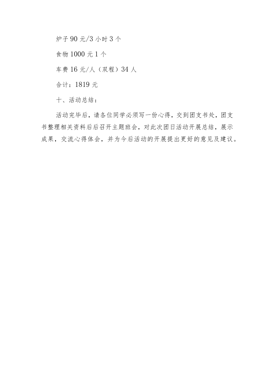 3、结网:gzzongjie/谢谢您的支持和鼓励!希望团员积极围绕“承昨日傲骨,拓今朝神韵”的团日活动主题,认真对待此次活动并积极参加、积极准备。展现当今大学生的素质,华农人的风采。八、活动准备:1、做好本次团日活动的通知,力求我班每位团员参加。2、对同学开展分组,每个宿舍为一组,外加一位女生,舍长担任组长,组长来担负起组织以及管理责任,即7人/组,其中有一组只有6人,总共34人。4、准备好工具,如袋子,等工具,同时做好烧烤的准备,去前先将工具食物分发到每个小组,负责搬运到目的的,组长做好管理工作。3、对同学提出注意安全,以及注意事项,确保活动安全有序地开展。九、活动经费:袋子0.5元/个10个炉子90元/3小时3个食物1000元1个车费16元/人(双程)34人合计:1819元十、活动总结:活动完毕后,请各位同学必须写一份心得,交到团支书处,团支书整理相关资料后后召开主题班会,对此次团日活动开展总结,展示成果,交流心得体会,并为今后活动的开展提出更好的意见及建议。