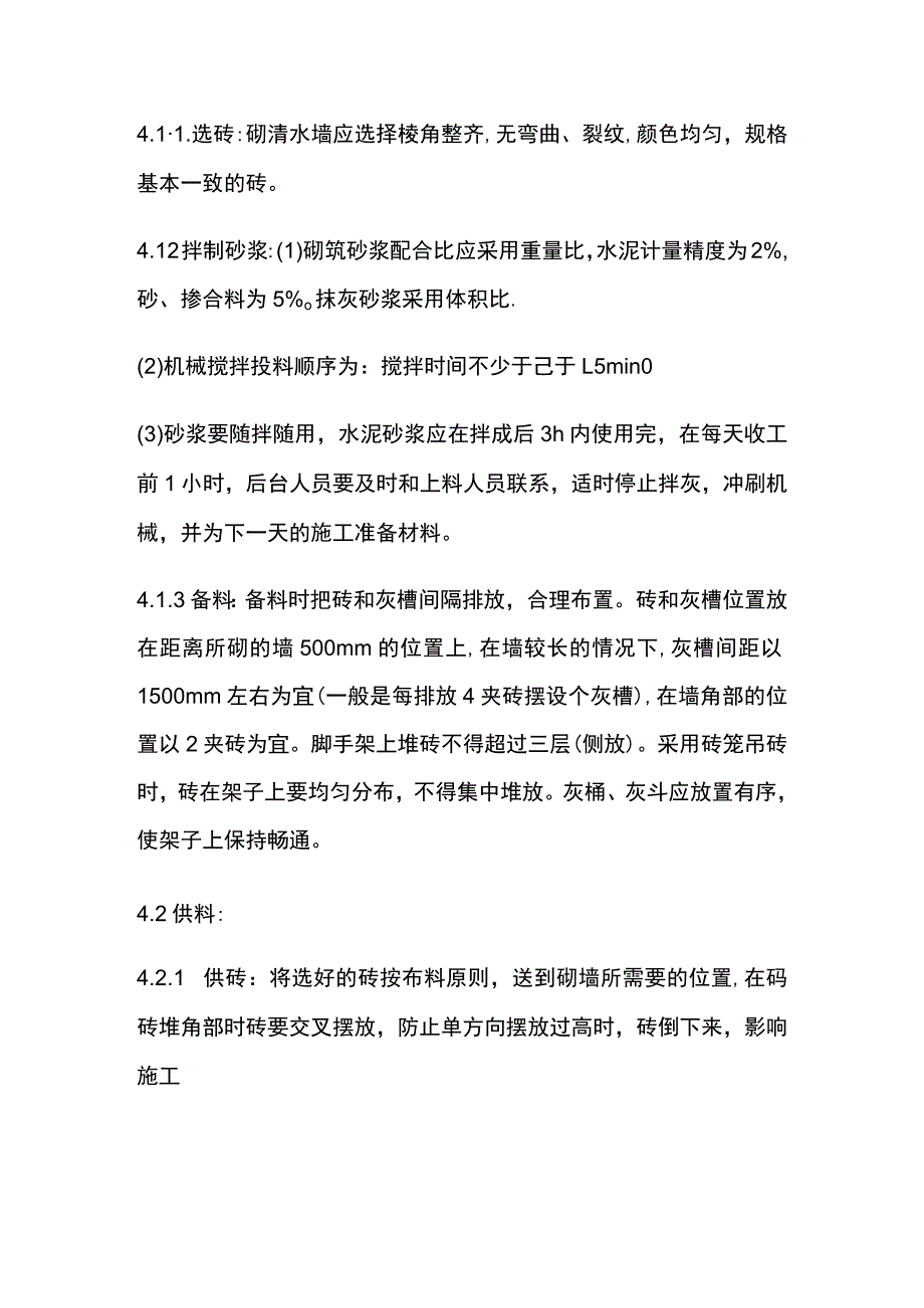 2、线、墙身线,根据进场砖的实际规格、尺寸,弹出门口、窗口位置线,经验线符合设计要求,方可砌筑。砖、砂浆的垂直运输,采用吊车进行。砂浆由试验室做好配合比,并严格按重量比计量。2)砌筑方法:砌体采用“三一”砌砖法,砖墙砌筑应上下错缝,内外搭接,灰缝平直、砂浆饱满。灰缝厚为IOmm,不应少于8mm,不能大于12mmo内外墙交接处,按规范要求设置拉结筋。构造柱砌体应预设构造柱竖筋,砌筑成马牙槎,并绑好拉结筋和构造柱筋。拉结筋的长度伸出墙体1m。洞口大于Im者,按要求做钢筋混凝土过梁。施工时做好安装工程需用的预埋件工作。3)质量保证措施砌筑前由测量人员与班长放好墙边线、墙体中心及洞口线,经技术人员检查无误
