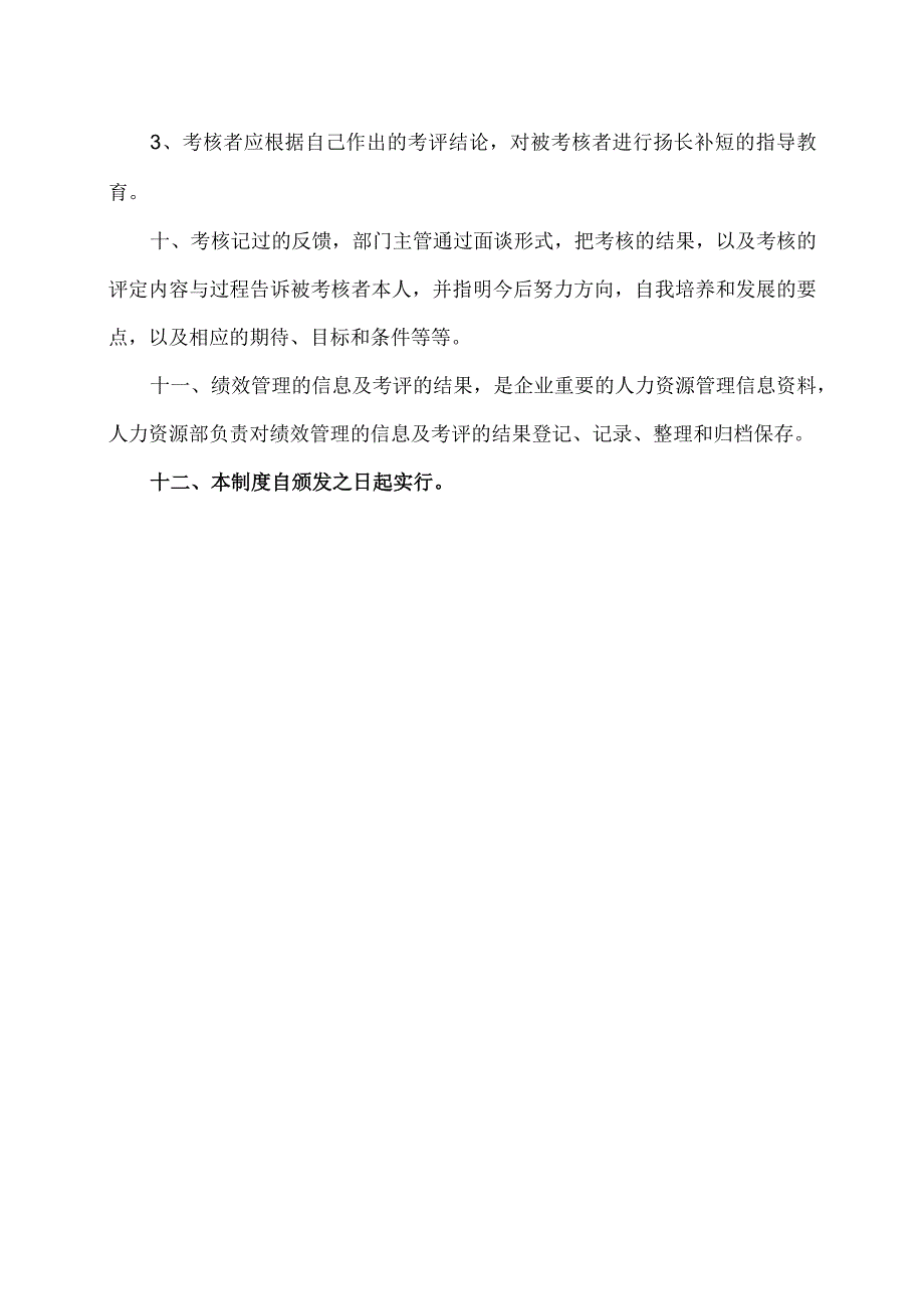 3、的尺度及分数分别为优秀(10分)、良好(8分)、一般(6分)、较差(4分)、极差(2分)。2、工作业绩、工作能力、工作态度的权重系数分别为4、3、3.3、假期考勤考核时,迟到早退一次扣0.5分,旷工一天扣2分,事假一天扣0.4分,病假扣0.2分。4、有奖惩记录的被考评人,考评时警告/表扬一次,扣/加1分;小过/小功一次,扣/加3分;大过/大功一次,扣/加9分.5、考评等级分为四个等级:总评分为90分以上的为“A”,总评分为7089分的为“B”,总评分为4069分的为“C”,总评分为40分以下的为“D”。九、为了使考核公平合理的进行,考核者必须遵守以下原则1、必须根据日常业务工作中观察到的具体事实作出评价。2、必须消除对被考核者的发恶感、同情心等偏见,排除对上、对下达各种顾虑,在自己的信念基础上作出评价。3、考核者应根据自己作出的考评结论,对被考核者进行扬长补短的指导教育。十、考核记过的反馈,部门主管通过面谈形式,把考核的结果,以及考核的评定内容与过程告诉被考核者本人,并指明今后努力方向,自我培养和发展的要点,以及相应的期待、目标和条件等等。十一、绩效管理的信息及考评的结果,是企业重要的人力资源管理信息资料,人力资源部负责对绩效管理的信息及考评的结果登记、记录、整理和归档保存。十二、本制度自颁发之日起实行。
