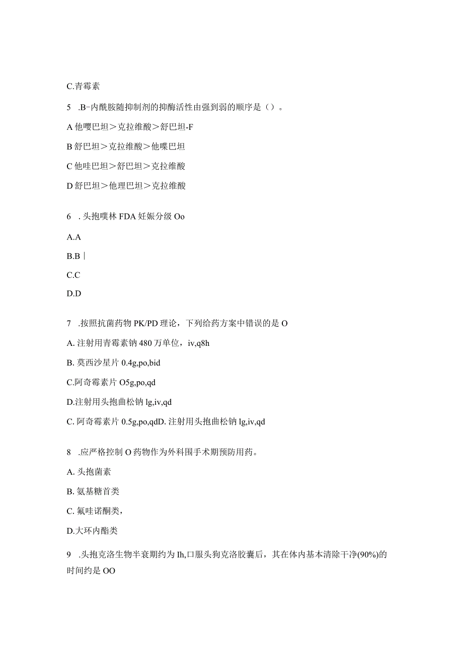 2、剂的抑酶活性由强到弱的顺序是()。A他嘤巴坦克拉维酸舒巴坦-FB舒巴坦克拉维酸他喋巴坦C他哇巴坦舒巴坦克拉维酸D舒巴坦他理巴坦克拉维酸6 .头抱噗林FDA妊娠分级OoA.AB.BC.CD.D7 .按照抗菌药物PK/PD理论,下列给药方案中错误的是OA.注射用青霉素钠480万单位,iv,q8hB.莫西沙星片0.4g,po,bidC.阿奇霉素片O5g,po,qdD.注射用头抱曲松钠lg,iv,qdC.阿奇霉素片0.5g,po,qdD.注射用头抱曲松钠lg,iv,qd8 .应严格控制O药物作为外科围手术期预防用药。A.头抱菌素B.氨基糖首类C.氟哇诺酮类,D.大环内酯类9 .头抱克洛生物半衰期约为I