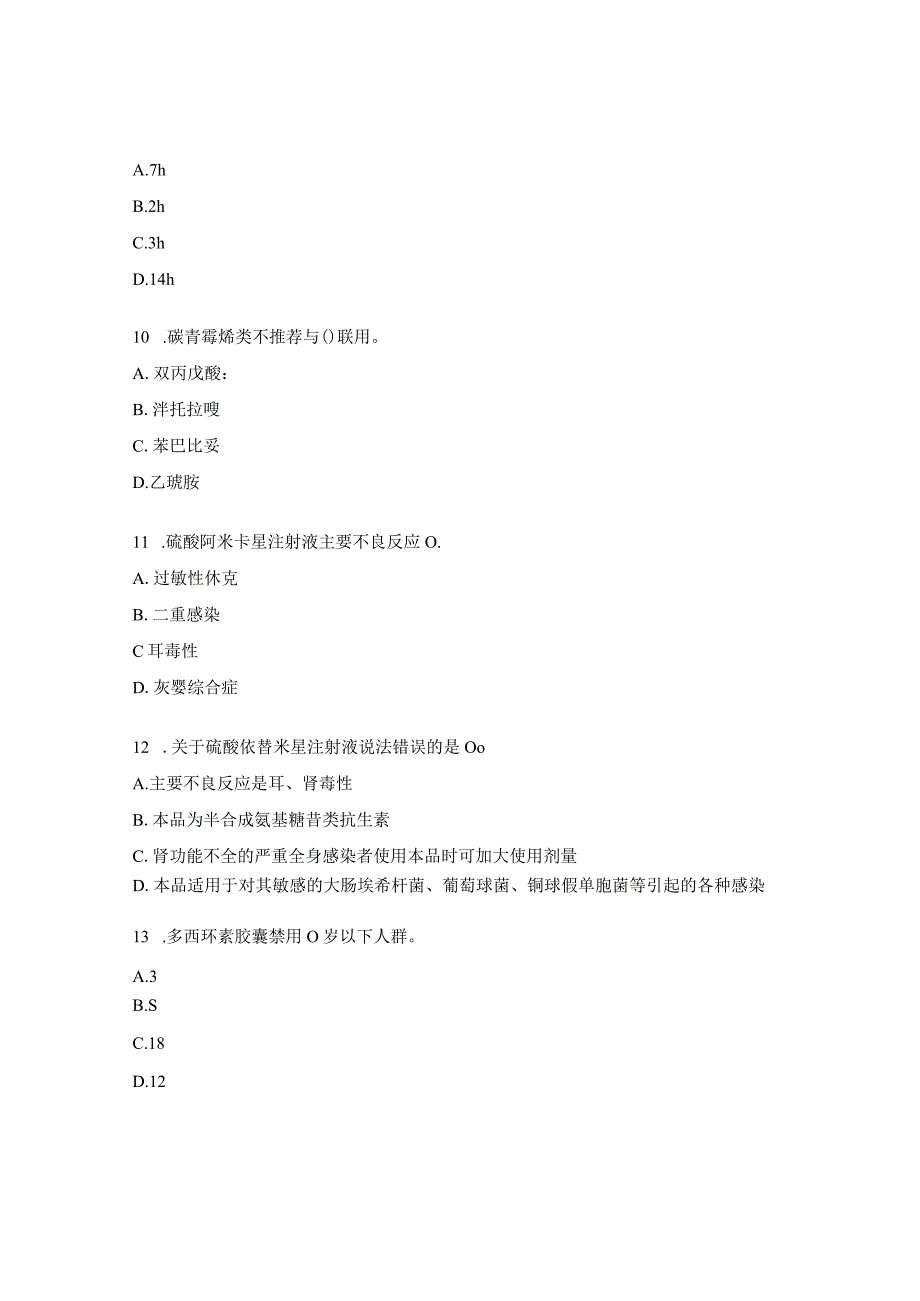 3、h,口服头狗克洛胶囊后,其在体内基本清除干净(90%)的时间约是OOA.7hB.2hC.3hD.14h10 .碳青霉烯类不推荐与()联用。A.双丙戊酸:B.泮托拉嗖C.苯巴比妥D.乙琥胺11 .硫酸阿米卡星注射液主要不良反应O.A.过敏性休克B.二重感染C耳毒性D.灰婴综合症12 .关于硫酸依替米星注射液说法错误的是OoA.主要不良反应是耳、肾毒性B.本品为半合成氨基糖昔类抗生素C.肾功能不全的严重全身感染者使用本品时可加大使用剂量D.本品适用于对其敏感的大肠埃希杆菌、葡萄球菌、铜球假单胞菌等引起的各种感染13 .多西环素胶囊禁用O岁以下人群。A.3B.SC.18D.1214 .注射用替加环素