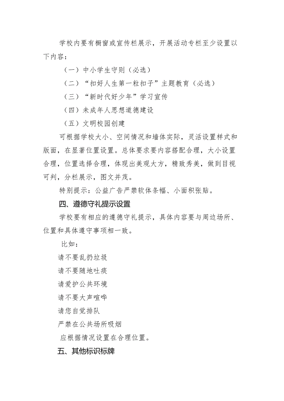 2、谐自由平等公正法治爱国敬业诚信友善(特别提示法治的“治”不能写成制度的“制”)(二)在显著位置展示关爱未成年人公益广告三、橱窗或宣传栏设置内容学校内要有橱窗或宣传栏展示,开展活动专栏至少设置以下内容:(一)中小学生守则(必选)(二)“扣好人生第一粒扣子”主题教育(必选)(三)“新时代好少年”学习宣传(四)未成年人思想道德建设(五)文明校园创建可根据学校大小、空间情况和墙体实际,灵活设置样式和版面,在显著位置设置。总体要求要内容搭配合理,大小设置合理,位置选择合理,体现出美观大方,精致秀美,做到目视可判,分栏展示,图文并茂。特别提示:公益广告严禁软体条幅、小面积张贴。四、遵德守礼提示设置学校要有