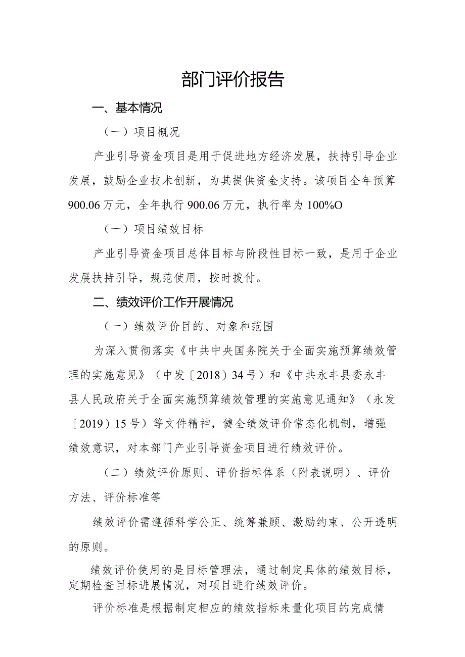 1、部门评价报告一、基本情况(一)项目概况产业引导资金项目是用于促进地方经济发展,扶持引导企业发展,鼓励企业技术创新,为其提供资金支持。该项目全年预算900.06万元,全年执行900.06万元,执行率为100%O(一)项目绩效目标产业引导资金项目总体目标与阶段性目标一致,是用于企业发展扶持引导,规范使用,按时拨付。二、绩效评价工作开展情况(一)绩效评价目的、对象和范围为深入贯彻落实中共中央国务院关于全面实施预算绩效管理的实施意见(中发2018)34号)和中共永丰县委永丰县人民政府关于全面实施预算绩效管理的实施意见通知(永发2019)15号)等文件精神,健全绩效评价常态化机制,增强绩效意识,对本部门