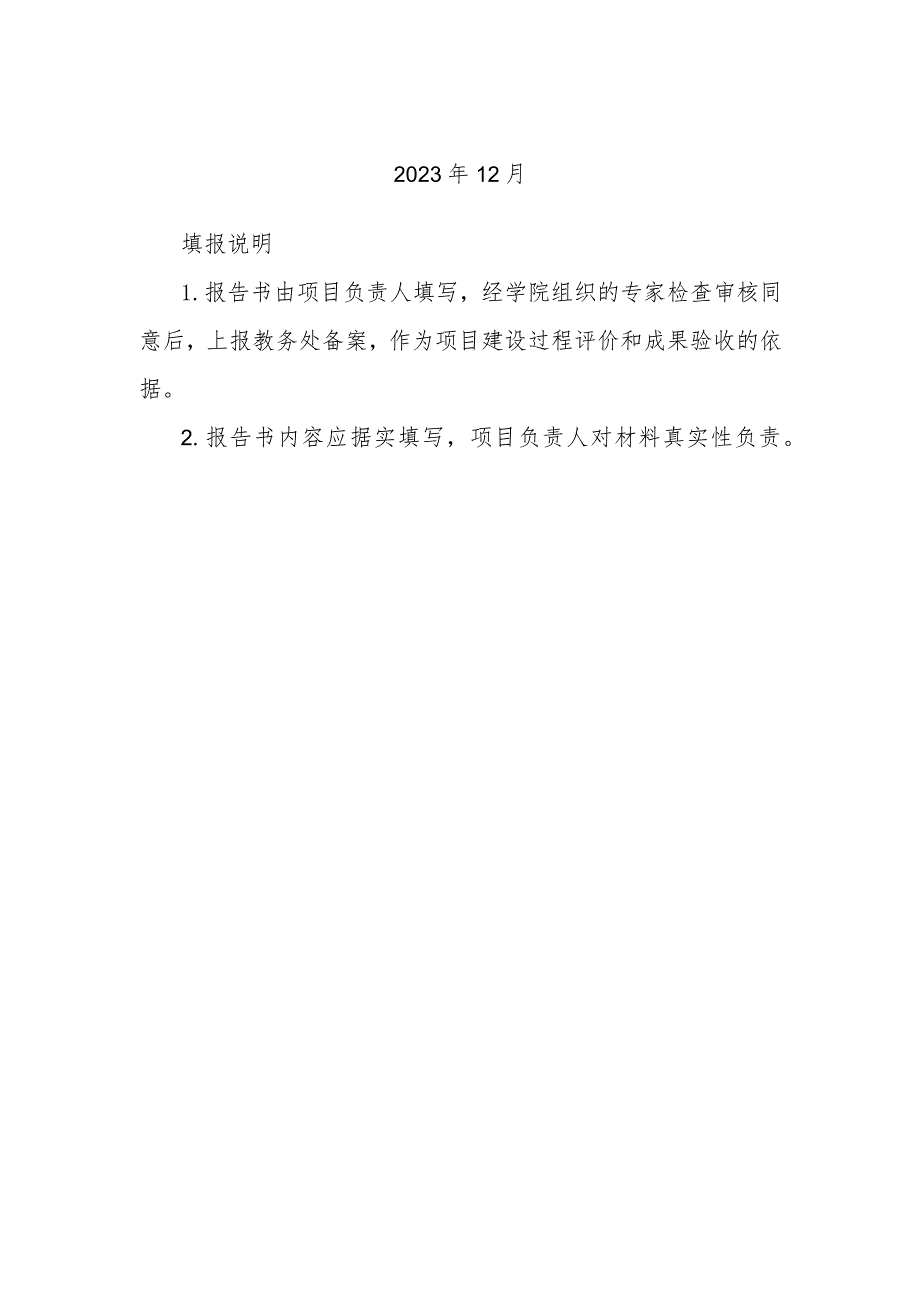 苏州城市学院“课程思政”示范课程项目中期检查报告课程名称:项目负责人:所在学院:立项时间:填报时间:2023年12月填报说明1.报告书由项目负责人填写,经学院组织的专家检查审核同意后,上报教务处备案,作为项目建设过程评价和成果验收的依据。2.报告书内容应据实填写,项目负责人对材料真实性负责。课程基本情况、改革目标、计划进度等。项目建设基本情况对照立项申报书,逐项总结课程思政的改革举措和实际完成进展。项目目标实际完成进度通过建设前后的对比,重点介绍立项建设以来取得的阶段性成果成效,如典型案例,教学资料,学生的反馈及感悟,督导听课评价反馈、教学获奖、发表论文、课程网站、研究报告等。项目阶段性成果存在问题分析及下一步建设计划。后期建设情况经费使用情况专家组意见检查结论:建议:组长签名:成员签名:年月日学院意见负责人签字:(单位公章)年月日学校意见(单位公章)年月日
