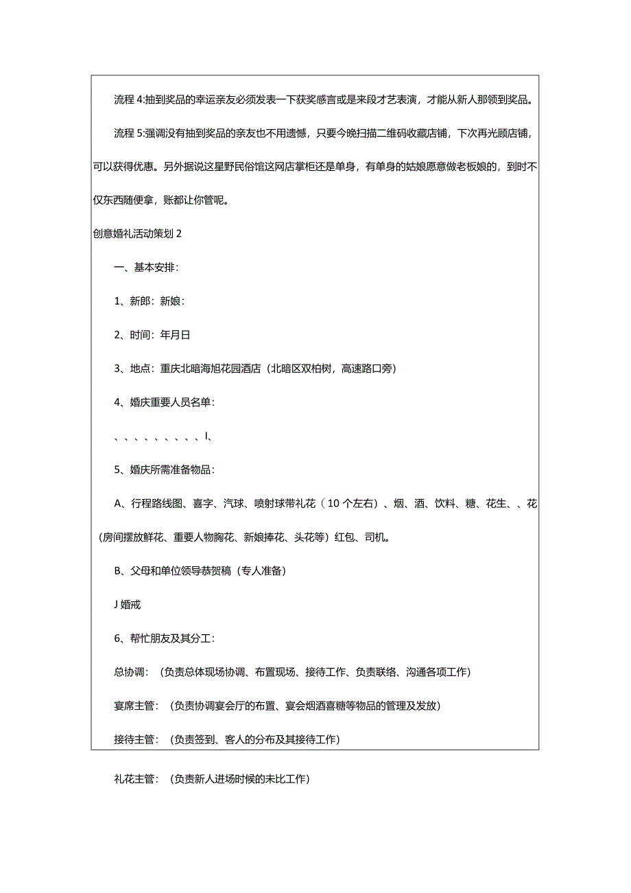 3、。流程3:在抽到幸运亲友上台领奖之前,谢谢小朋友的帮忙,送他们每人一份卡通喜字,调侃小朋友保留到自己结婚用,或是现在送给自己喜欢的小对象。然后让他们下台。流程4:抽到奖品的幸运亲友必须发表一下获奖感言或是来段才艺表演,才能从新人那领到奖品。流程5:强调没有抽到奖品的亲友也不用遗憾,只要今晚扫描二维码收藏店铺,下次再光顾店铺,可以获得优惠。另外据说这星野民俗馆这网店掌柜还是单身,有单身的姑娘愿意做老板娘的,到时不仅东西随便拿,账都让你管呢。创意婚礼活动策划2一、基本安排:1、新郎:新娘:2、时间:年月日3、地点:重庆北暗海旭花园酒店(北暗区双柏树,高速路口旁)4、婚庆重要人员名单:、I、5、婚庆