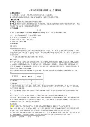 简洁的线性规划问题(2)导学案心【学习目标】1 .从实际情境中抽象出一些简洁的二元线性规划问题,并加以解决;2 .体会线性规划的.基本思想,借助几何直观解决一些简洁的线性规划问题.,【重点难点】教学重点,利用图解法求得线性规划问题的最优解教学难点:把实际问题转化成线性规划问题,并给出解答,解决难点的关键是依据实际问题中的已知条件,找出约束条件和目标函数,利用图解法求得最优解。【学问链接】x-4y-3复习1:已知变量x,y满意约束条件<3x+5y25,设z=2x+y,取点(3,2)可求得z=8,取点xl(5,2)可求得ZmttX=I2,取点(1,1)可求得Zmill=3取点(0,0)可求得z=0,取点(3,2)叫做点(0,0)叫做,点(5,2)和点(1,1)复习2:阅读课本Ps8至P9I【学习过程】X学习探究线性规划在实际中的应用:线性规划的理论和方法主要在两类问题中得到应用,一是在人力、物力、资金等资源肯定的条件下,如何运用它们来完成最多的任务;二是给定一项任务,如何合理支配和规划,能以最少的人力、物力、资金等资源来完成该项任务.下面我们就来看看线性规划在实际中的一些应用:X典型例题例1养分学家指出,成人良好的日常饮食应当至少供应0.075kg的碳水化合物,0.06kg的蛋白质,006kg的脂肪,Ikg食物A含有0105kg碳水化合物,0.07kg蛋白质,0.14kg脂肪,花费28元;而Ikg食物B含有0.105kg碳水化合物,0.14kg蛋白质,0.07kg脂肪,花费21元.为了满意养分专家指出的日常饮食要求.,同时使花费最低,须要同时食用食物A和食物B多少kg?例2要将两种大小不同的钢板截成A、氏C三种规格,每张钢板可同时截得三种规格的小钢板的块数如下表所示:7类型钢A规格B规格C规格第一种钢板、211其次种钢板123今须要三种规格的成品分别为12块、15块、27块,各截这两种钢板多少张可得所需A、B、C、三种规格成品,且使所用钢板张数最少?变式:第一种钢板为la2,其次种为2产,各截这两种钢板多少张,可得所需三种规格的成品且所用钢板面积最小?例3一个化肥厂生产甲乙两种混合肥料,生产1车皮甲肥料的主要原料是磷酸盐43硝酸盐18t;生产1车皮乙种肥料的主要原料是磷酸盐It,浦酸盐15t.现库存磷酸盐IOt,硝酸盐663在此基础上生产这两种混合肥料.若生1车皮甲种肥料能产生的利润为100oO元;生产1车皮乙种肥料,产生的利润为5000元.那么分别生产甲、乙两种肥料各多少车皮,能够产生最大的利润?派动手试试练1.某厂拟生产甲、乙两种适销产品,每件销售收入分别为3000元、2019元.甲、乙产品都须要在A、8两种设备上加工,在每台A、8设备上加工1件甲设备所需工时分别为lh>2h,加工1件乙和设备所需工时分别为2h、Ih,4、8两种设备每月有效运用台时数分别为40Oh和500h.如何支配生产可使收入最大?练2.某家电生产企业依据市场调查分析,确定调整产品生产方案,打算每周(按40个工时计算)生产空调器、彩电、冰箱共120台,且冰箱至少生20台.已知生产这些家电产品每台所需工时和每台产值如下表:家电名称空调器彩电冰箱工时_23j_4产值/千元432问每周应生产空调器、彩电、冰箱共多少台,才能使产值最高?最高产值是多少?(以千元为单位)【学习反思】派学习小结简洁线性规划问题就是求线性目标函数在线性约束条件下的最优解,无论此类题目是以什么实际问题提出,其求解的格式与步骤,是不变的:(1)找寻线性约束条件,线性目标函数;(2)由二元一次不等式表示平面区域做出可行域:(3)在可行域内求目标函数的最优解.派学问拓展含肯定值不等式所表示的平面区域的作法:(1)去肯定值,转化为不等式组;(2)采纳分零点探讨,或分象限探讨去肯定值;(3)利用对称性可避开探讨.©【基础达标】派自我评价你完成本节导学案的状况为().A.很好B.较好C.一般.D.较差X当堂检测(时量:5分钟满分:10分)计分:1 .完成一项装修工程,请木,工需付工资每人50元,请瓦工需付工资每人40元,现有工人工资预算2019元,设木工工人,瓦工y人,请工人的约束条件是().A.50x+40=2000B.50x+40y2000C.50x+40y2000D.40x+50.y20000x42.已知尤),满意约束条件,则z=2x+5y的最大值为().x+2y8x0,y0A.19B.18C.17D.162x+3y243 .变量x,y满意约束条件?+3丫,则使得z=3x+2y的值的最小的(x,y)是().2x+9y36x0,0A.(4,5)B(3,6)C.(9,2)D.(6,4)x-2y+404 .(2019陕西)已知实数x,y满意约束条件,2x+y-20则目标函数Z=X+2y的最大值为3x-y-30x-y+305 .(2019湖北)设变量匹),满意约束条件卜+30则目标函数2x+y的最小值为-2x3电视台应某企业之约播放两套连续剧.其中,连续剧甲每次播放时间为80min,其中广告时间为Imin,收视观众为60万;连续剧乙每次播放时间为40min,其中广告时间为Imin,收视观众为20万.己知此企业与电视台达成协议,要求电视台每周至少播放6min广告,而电视台每周只能为该企业供应不多于32Omin的节目时间.假如你是电视台的制片人,电视台每周播映两套连续剧各多少次,才能获得最高的收视率?